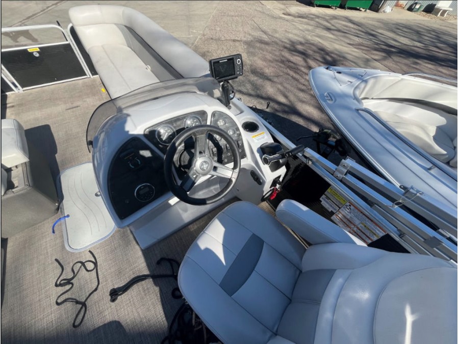 Attention to detail is evident inside this Sweetwater SW 2286 SB boat. From the ivory base vinyl color to the anodized silver canopy frame, every element contributes to a polished look.