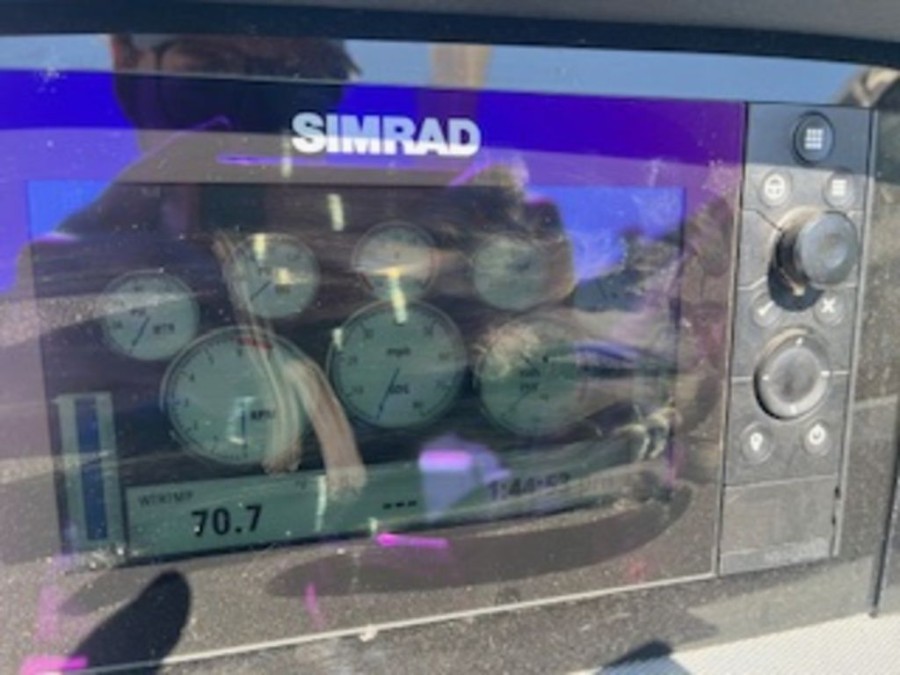 The cockpit is finished in custom vinyl‑wrapped fiberglass side panels and features diamond pattern non‑skid flooring. Inside, the aft bench seating converts from a full bench to a sun lounge with reversible backrests. Dedicated storage compartments hold your cooler (36 quart capacity) and other gear.