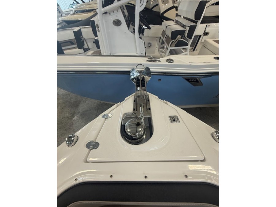 Your engine compartment features automatic bilge pumps, a bilge blower, and gel‑coated surfaces to keep it clean. The electric hatch and forced air ventilation provide ease of maintenance.