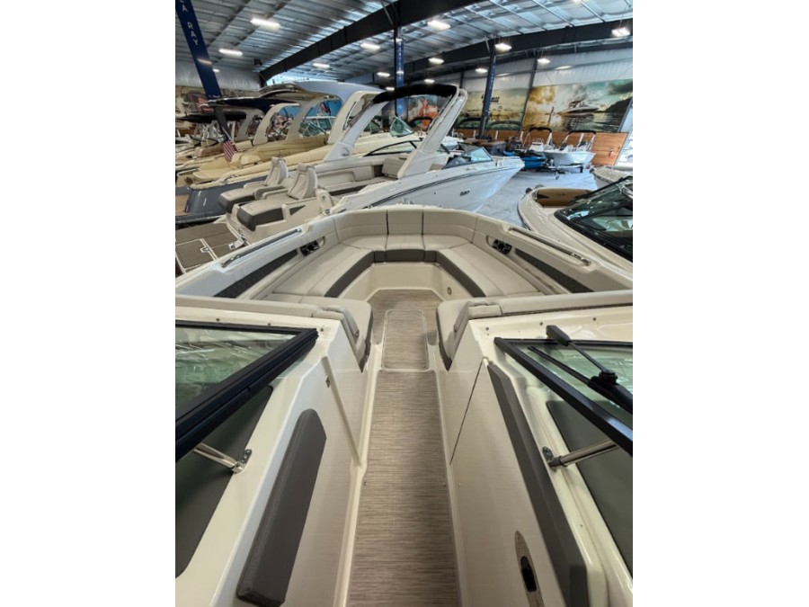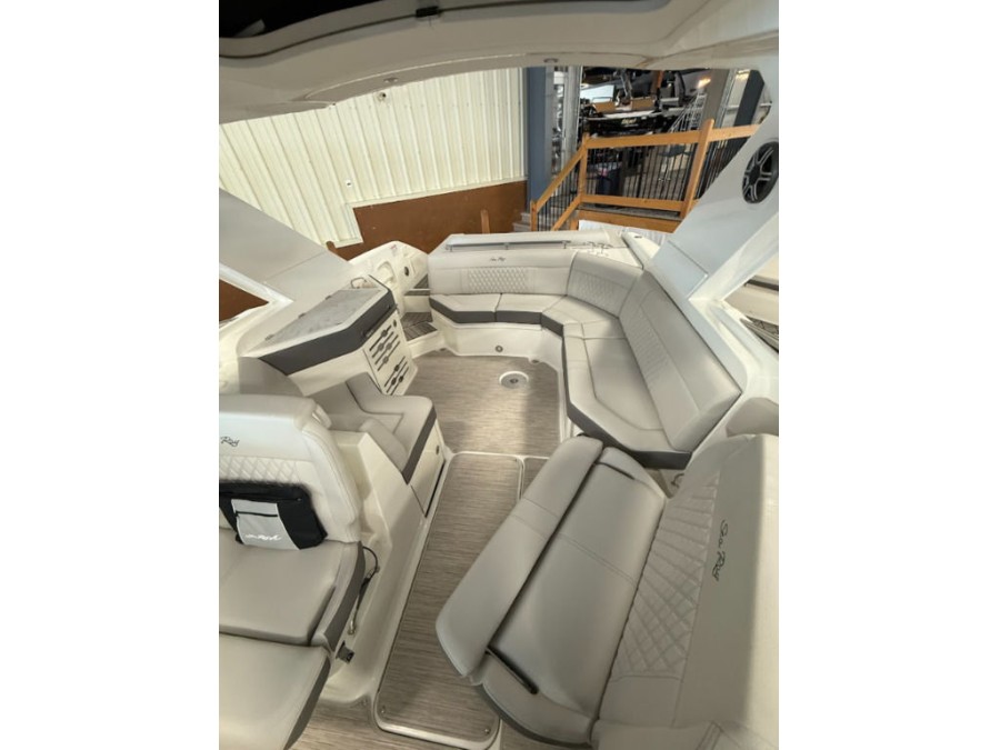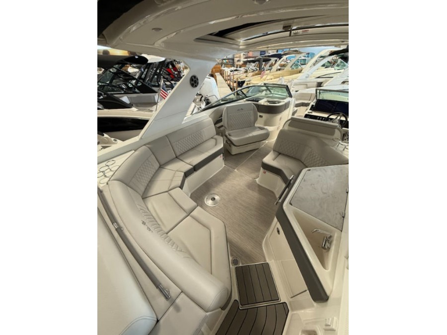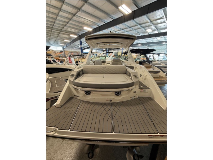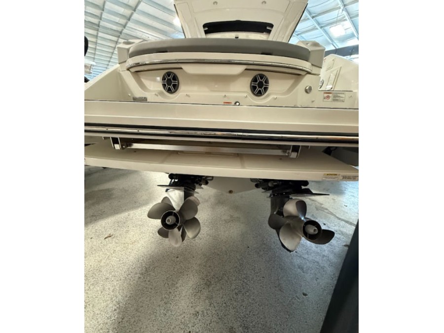 This model offers powerful twin engines, either MerCruiser or Mercury Verado outboards. The advanced joystick steering system ensures precise handling while Dynamic Running Surface (DRS) technology keeps the ride smooth in any condition.
