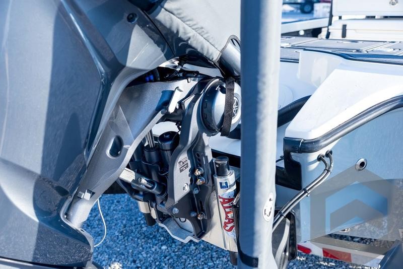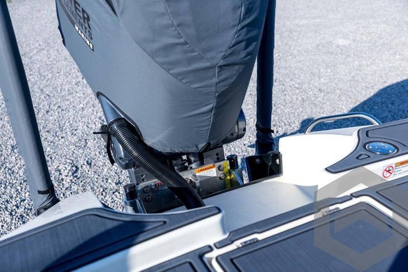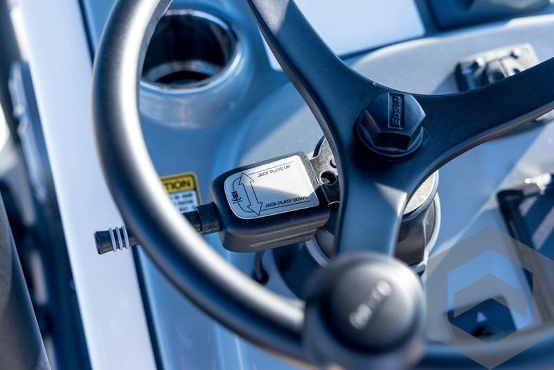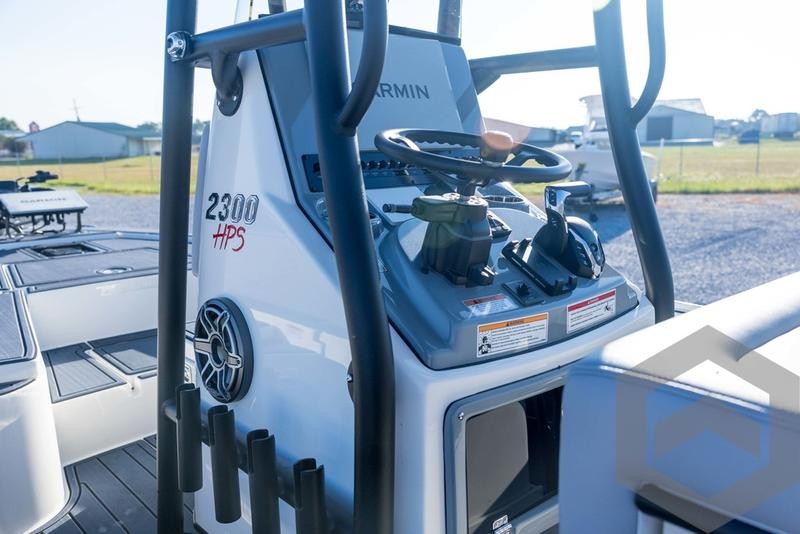 The 2300 HPS is fitted with hydraulic steering, an electronic power‑steering system for effortless control in tight spots, and trim tabs that keep the boat balanced under load.