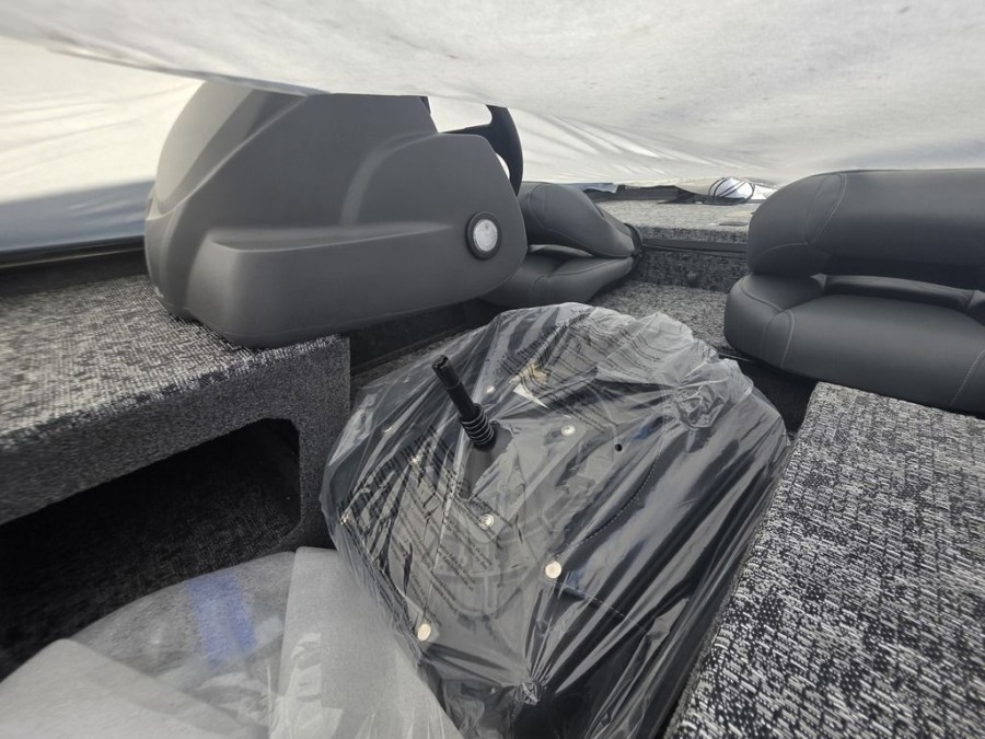 The boat includes an 800 GPH bilge pump, stowable navigation lights, bow & console courtesy lights and two battery trays for Interstate® batteries – one cranking and one trolling. All wiring is protected with abrasion‑resistant conduit.