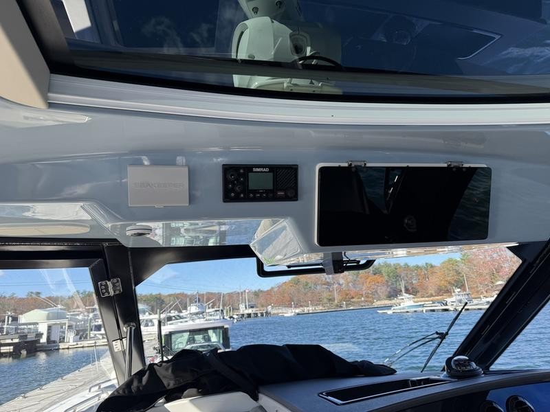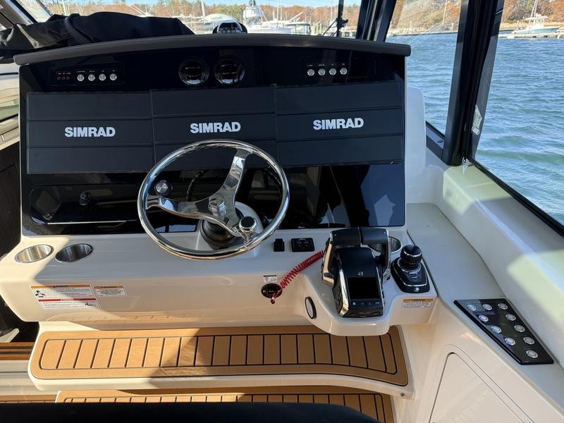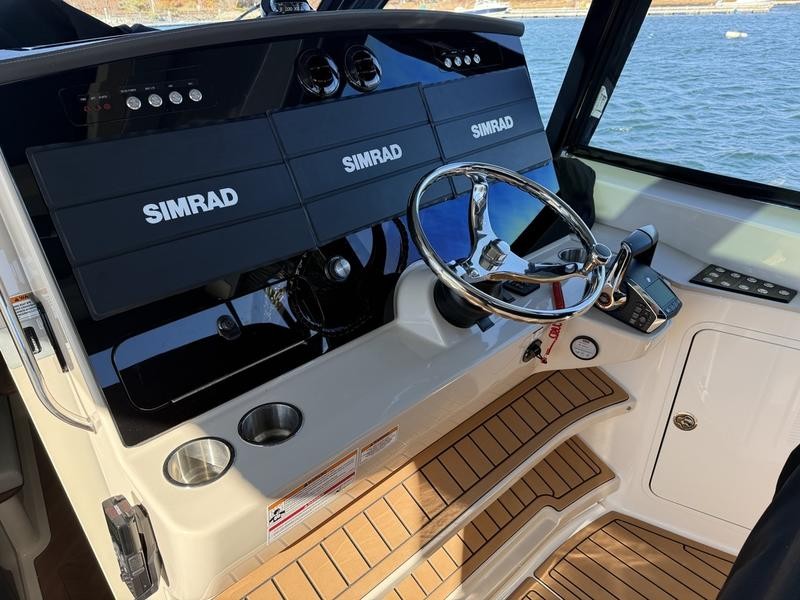 The helm console is a hub of modern technology and convenience. It features comprehensive electrical switch panels with illuminated text, multiple drink holders, and integrated charging receptacles (USB/12V) right at the command station. For optimal comfort during long days on board: