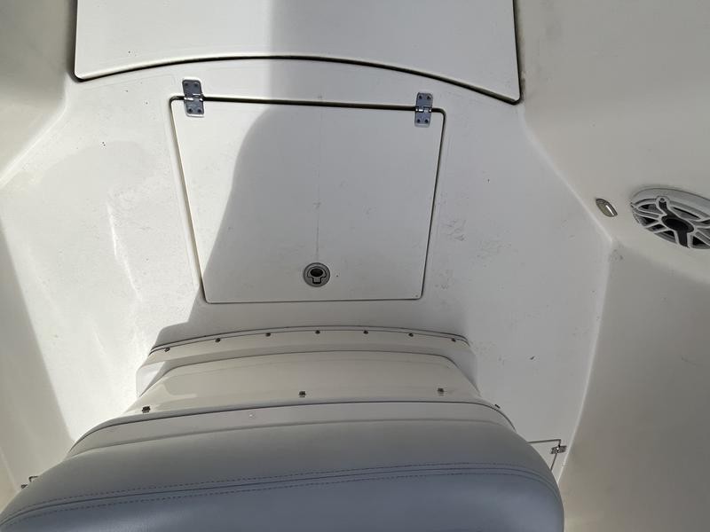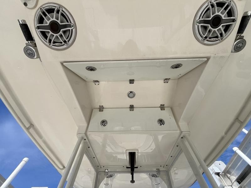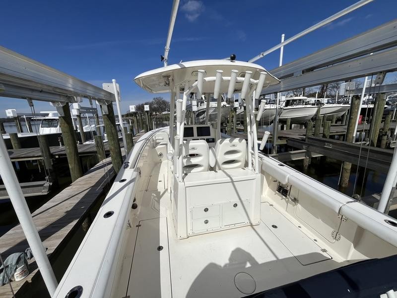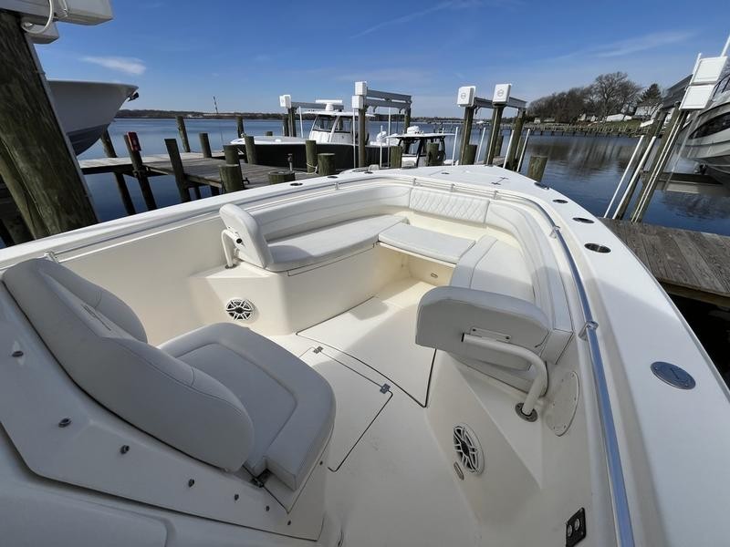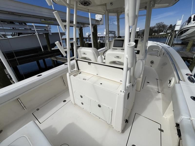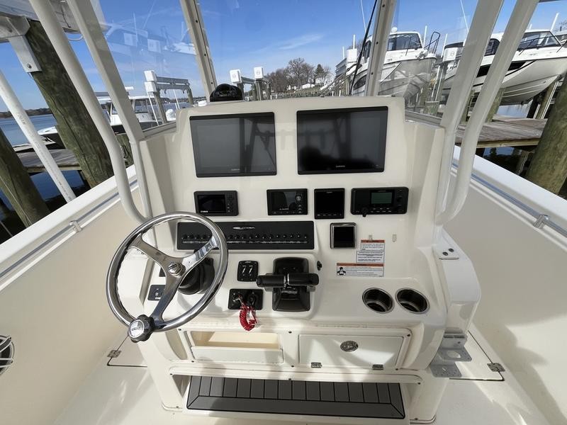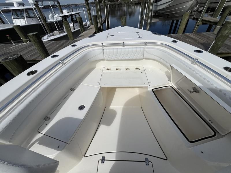 The console area has been fully upgraded to maximize efficiency, featuring a dedicated freshwater sink and comprehensive rigging station. All operational controls and electronic screens are perfectly situated in the new console design, optimizing both form and function on this powerful center console boat. The overall build quality includes premium fade-resistant gelcoat finishes and durable stainless steel hardware throughout.