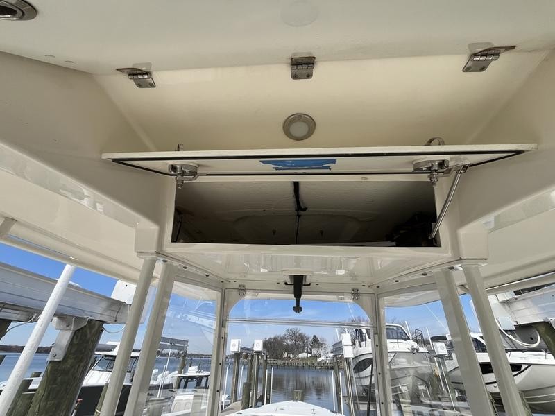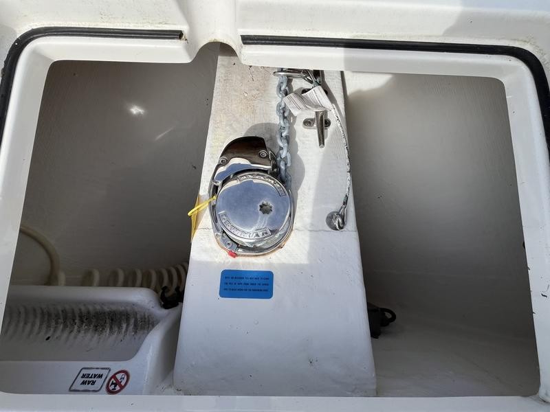 The advanced electronics package includes twin Garmin GPS screens, essential radar systems, and VHF radios, providing all necessary navigation tools for any serious boating trip. Additional amenities include a power assist bow table that flushes seamlessly into the floor when not in use, maximizing usable space on this impressive vessel.