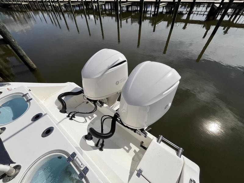 This robust center console boat is powered by impressive twin outboard engines (Yamaha F300XCA), delivering a combined power output ideal for tackling deep water effortlessly. The handling capabilities are enhanced with electronic optimus steering and integrated trim tabs, ensuring the Cobia 301CC maintains optimal stability regardless of conditions.