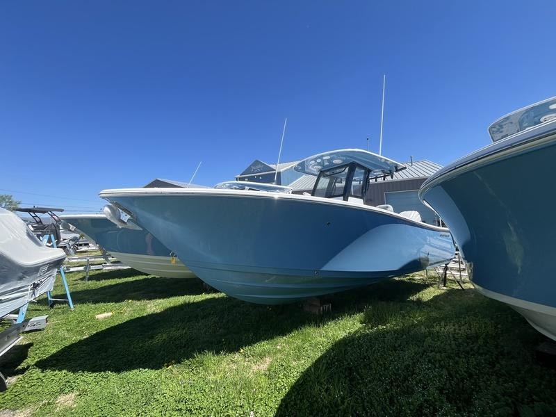 Powering this vessel is a reliable Yamaha outboard motor setup (300 HP), ensuring smooth handling regardless of conditions. This powerful combination provides exceptional speed and efficiency, making it ideal for reaching remote fishing spots quickly. The boat features a durable fiberglass hull with the attractive Harbor Haze color scheme complemented by crisp white bottoms.
