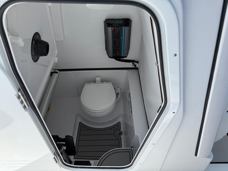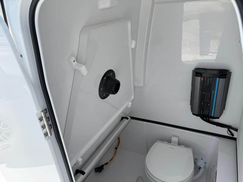 From the moment you step aboard, the features of this center console boat become apparent. The design prioritizes water access; dual side entry doors open a full 180 degrees, providing completely unobstructed movement to the fishing cockpit. Above, a feature-packed fiberglass hardtop offers comprehensive shade and storage, housing integrated lights, speakers, and multiple rod holders for immediate use.