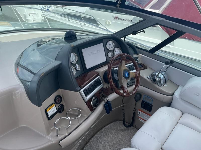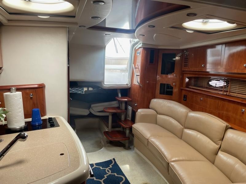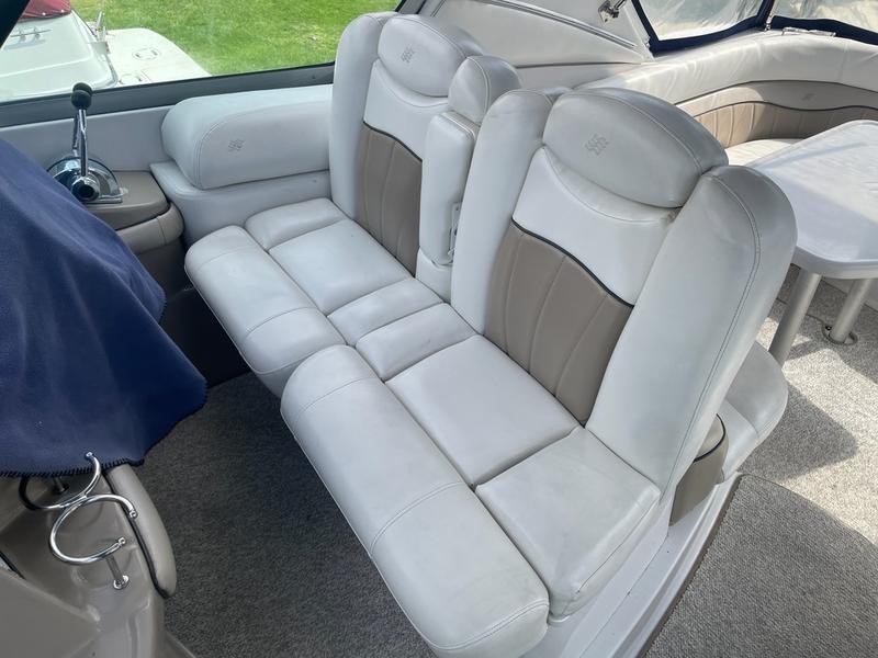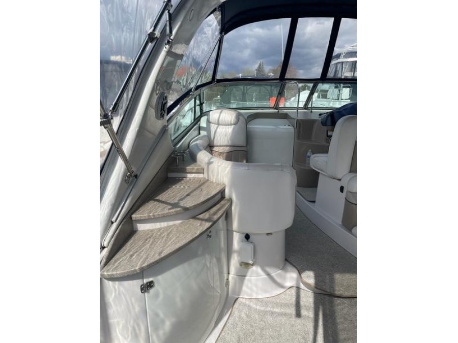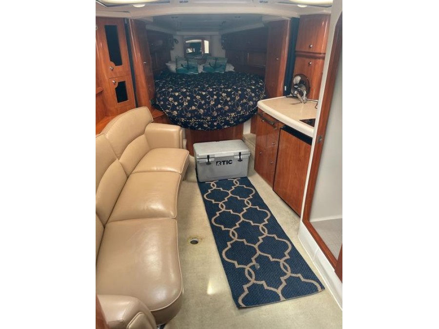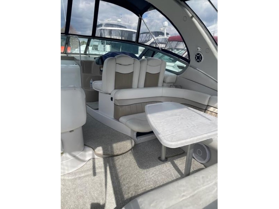 The cockpit is outfitted with new carpet, a 2023 bimini top, and updated rear isolglass for added privacy.