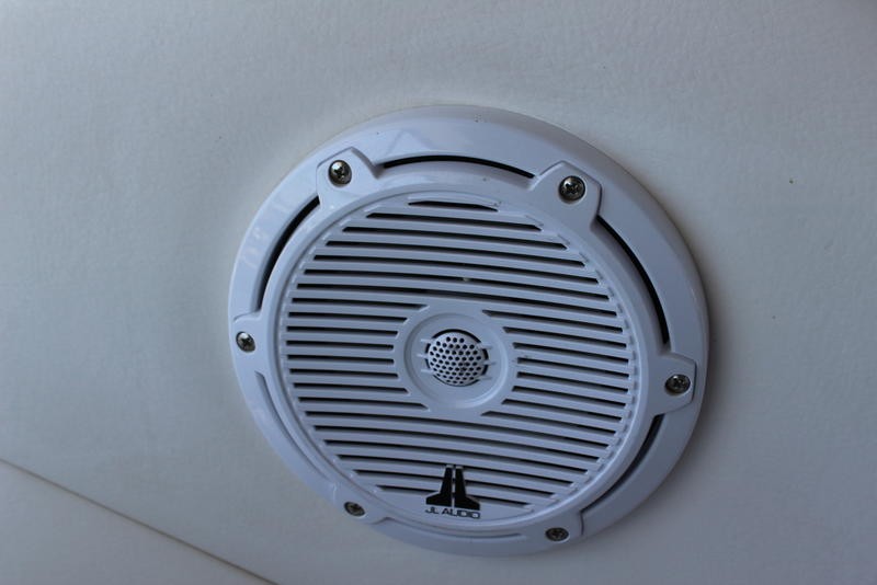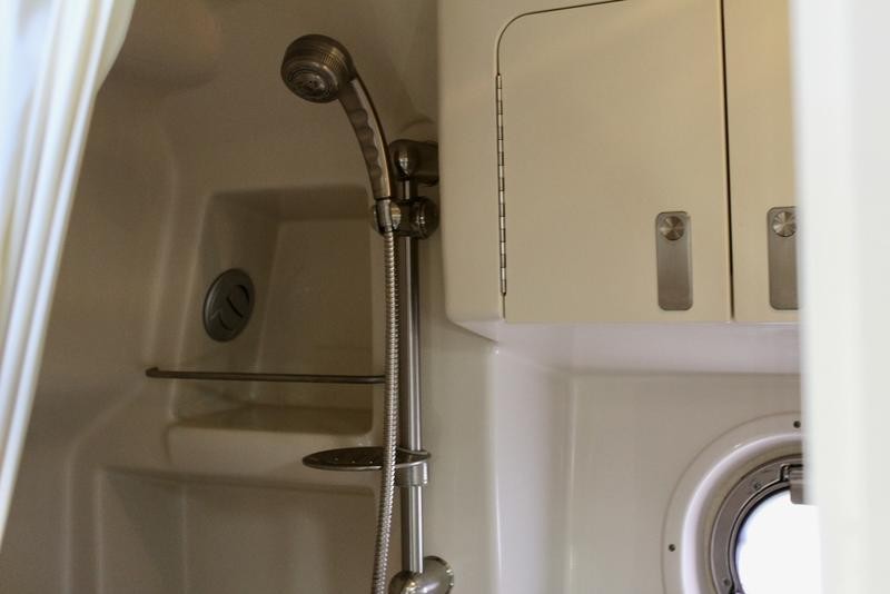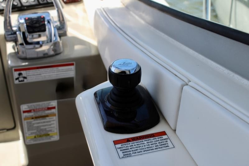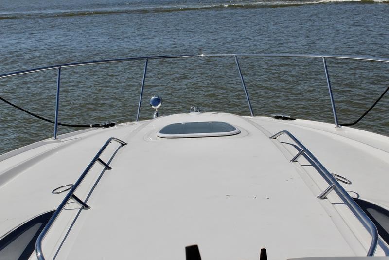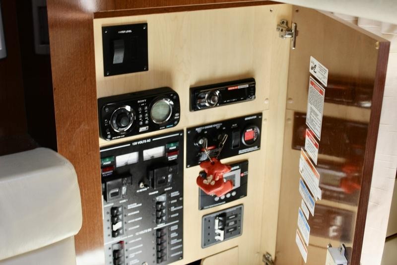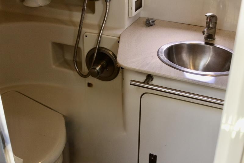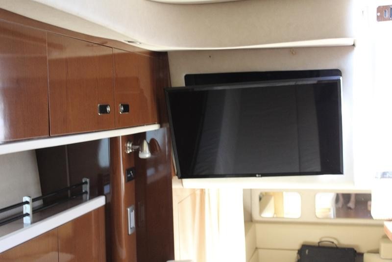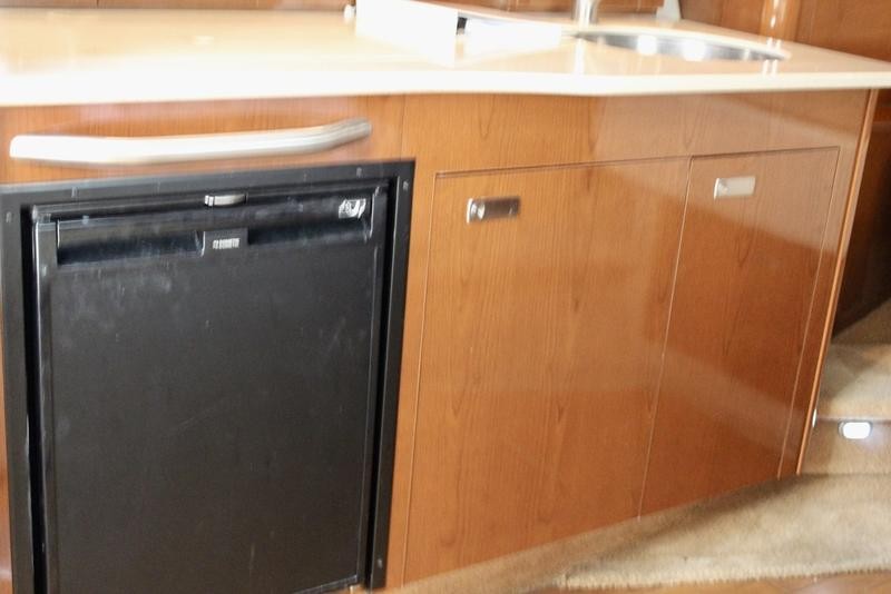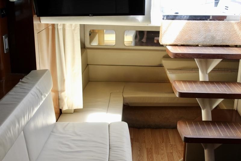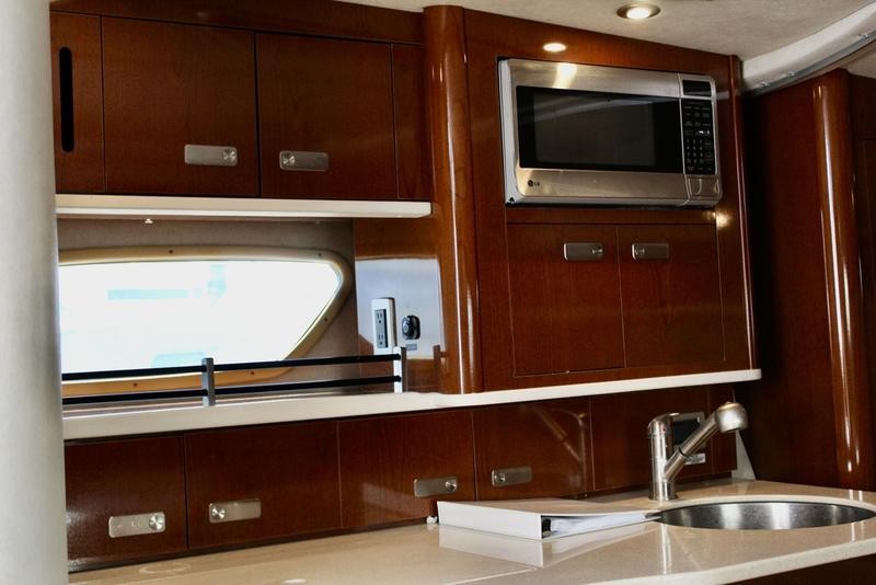 The cabin space offers thoughtful design, incorporating high-end finishes throughout the boat's interior. Sleep is comfortable with a forward V-berth and a flexible mid-cabin lounge that converts seamlessly into an additional sleeping area. Culinary needs are met by a fully equipped galley featuring solid-surface countertops, a refrigerator, microwave oven, and stove top.