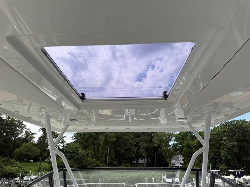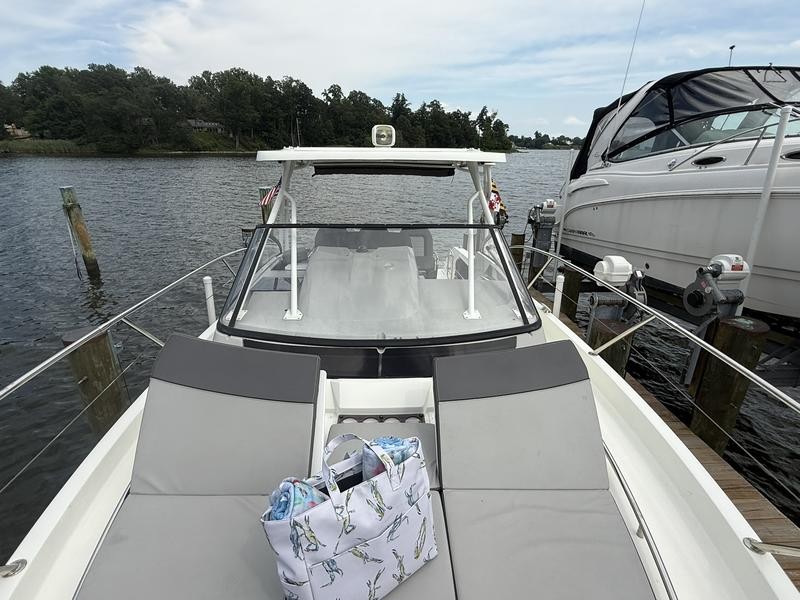 Additional amenities include a ski mast for water sports, full canvas/glass enclosure, Fusion stereo system (two zones), Westerbeke generator, bow thruster, helm‑controlled windlass anchor system, double‑stepped hull, HVAC air conditioning and heating, and more. The vessel has been meticulously maintained with only 445 hours of engine use and a 3.5 kW generator running just 49 hours.