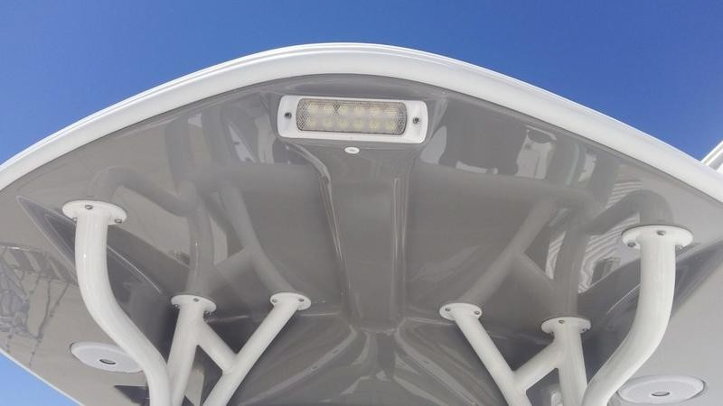 Its hardtop is both oversized and streamlined, giving the boat a modern silhouette while the spacious box above offers ample storage for tackle, gear, or personal items. Inside, multiple lighting options create an inviting ambiance, complemented by six flush‑mounted speakers that fill the cabin with crisp sound. Standard telescoping outriggers ensure safety on heavy seas.
