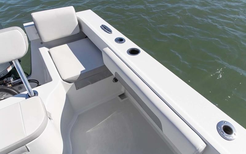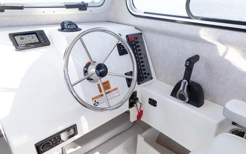 Pilothouse (68"L x 78"W): Tinted Windshields (Port Fixed, Stbd. Opening), Port & Stbd. Sliding Windows w/ Screens, Headliner, Ladder Back Chair w/ Cushions & Footrest, Port Inboard Facing Lounge Seat w/Tackle Cabinet (3 tray), Interior Storage & Grab Rails (Fore & Aft), Storage Tray (Stbd.), Non-Skid on Pilothouse Floor, LED Cabin Lighting