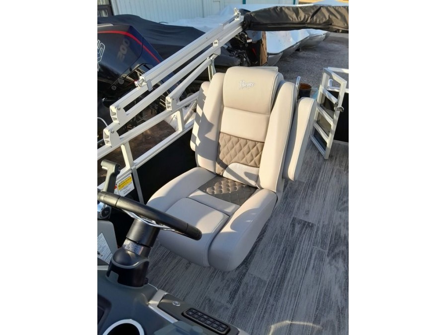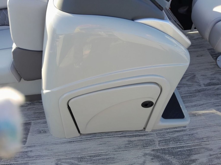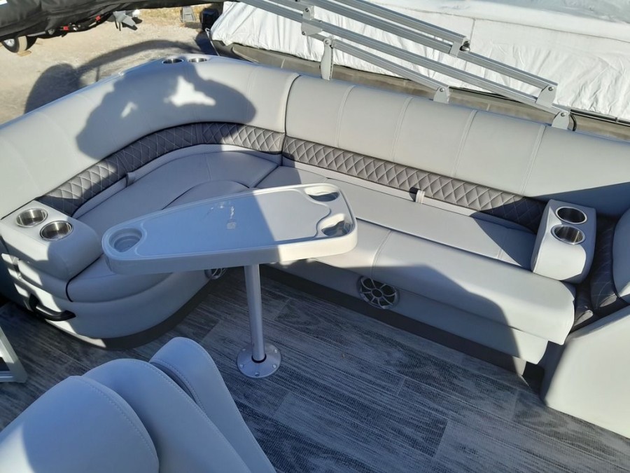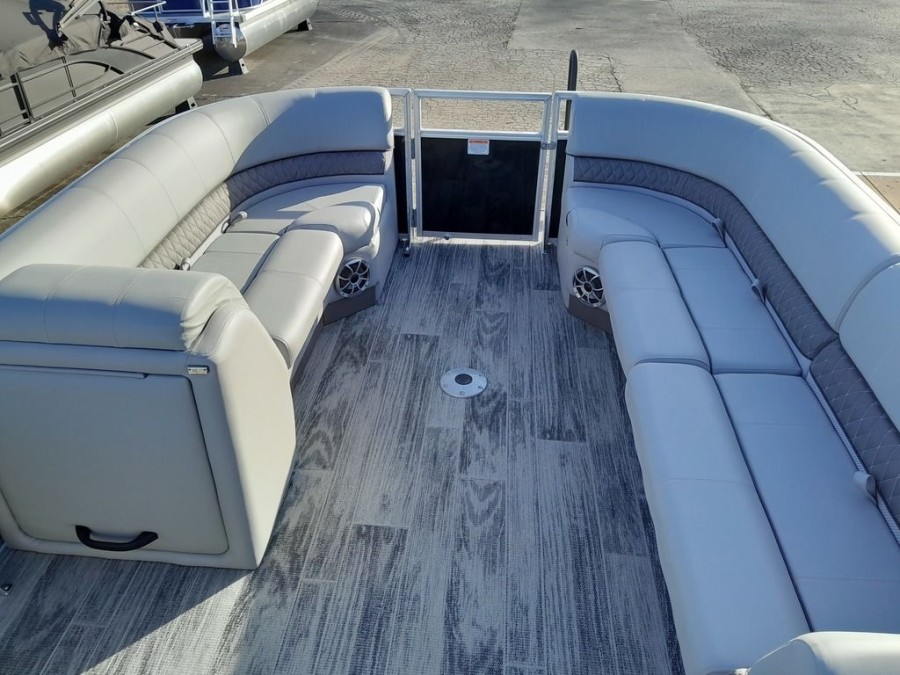 A generous deck offers ample room for family fun or storage needs. Inside, a plush seating area with rotomolded, drained storage keeps essentials organized and dry. The updated helm seat, no‑feedback steering wheel, and comprehensive gauge cluster provide an intuitive navigation experience.