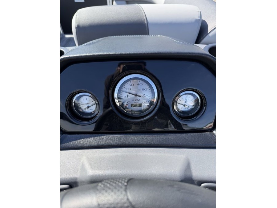 The new Shoreline woven vinyl flooring adds durability without sacrificing style. Durable frame seat bases support the Pure Comfort reclining captain’s chair, kidney‑shaped table, two chaise lounges, and powder‑coated seat hinges that ensure longevity even in saltwater environments. A stern storage compartment and waste container keep your gear organized.