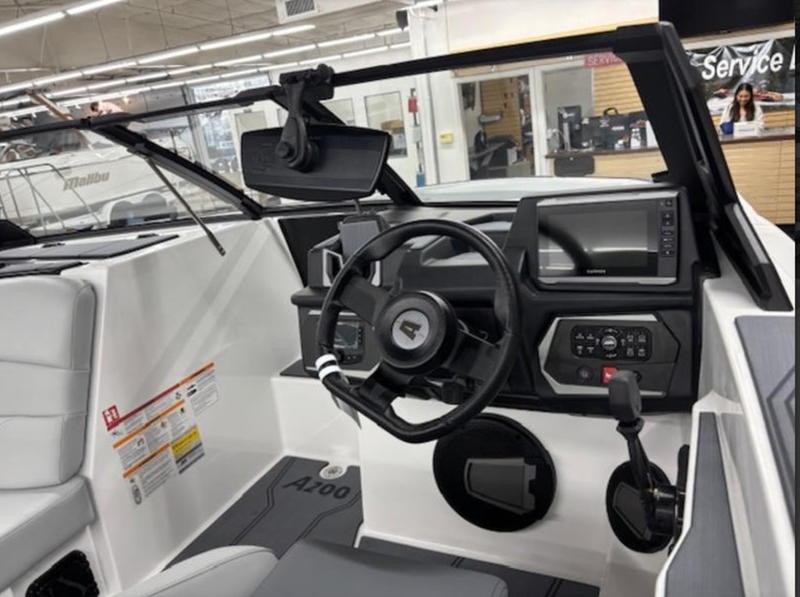 The minimalist dashboard centers a 7‑inch touchscreen, giving you quick access to all vital boat metrics and wake settings. The A200 is powered by either the Malibu Monsoon M5Di® or the higher‑output M6Di®, both of which deliver more torque, lower fuel use, reduced emissions, greater reliability, and quieter operation than comparable engines.
