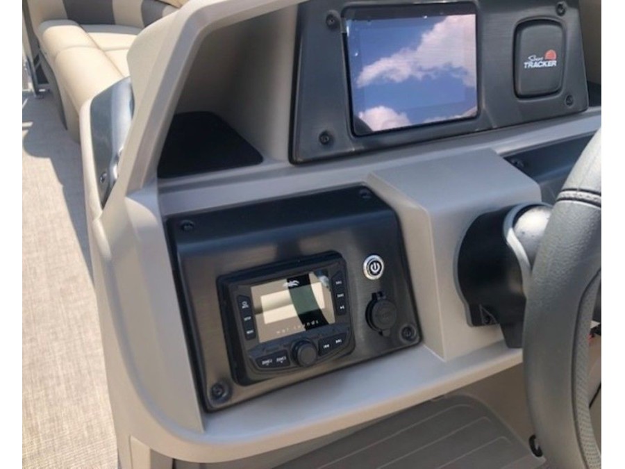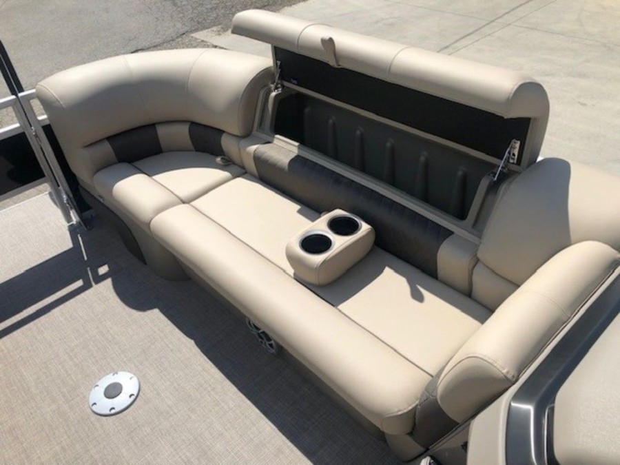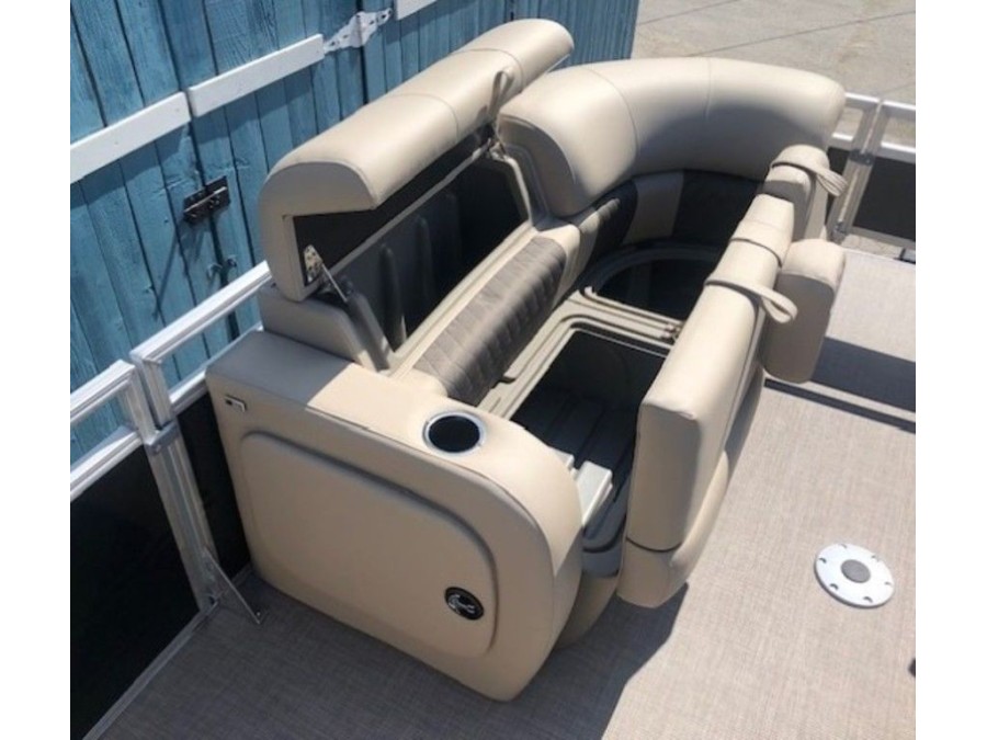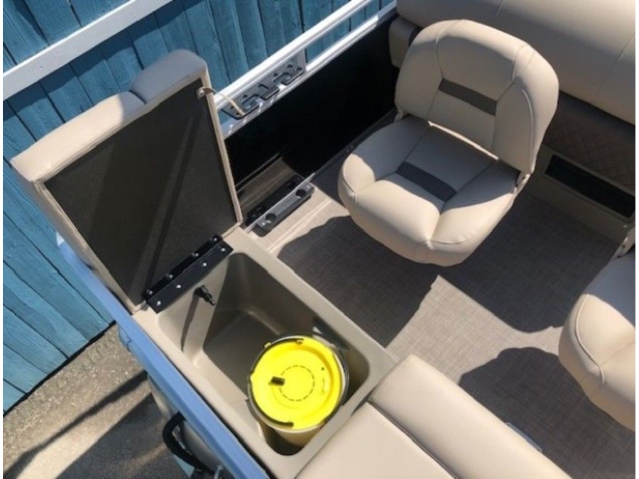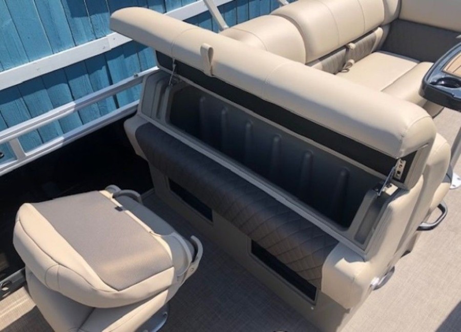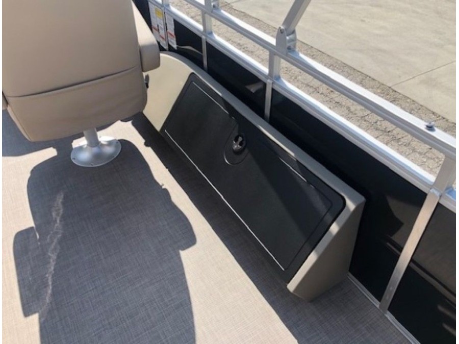 The aft deck of this Sun Tracker model is optimized for serious anglers. It features dual comfortable fishing chairs perfect for long days on the water. Essential equipment includes an aerated livewell, complete with a convenient lift-out bait bucket, alongside dedicated rod storage and a secure lockable rod box. This Sportfish 22 DLX provides everything needed to maximize your catch.