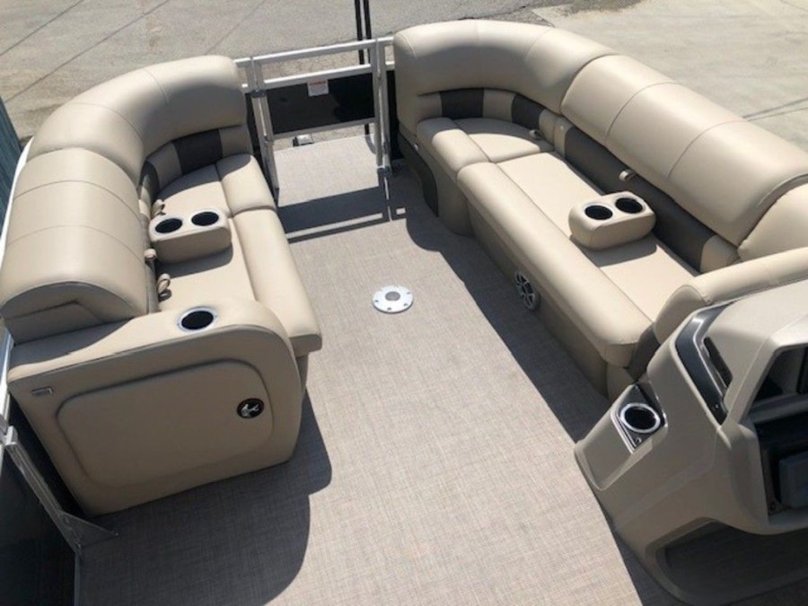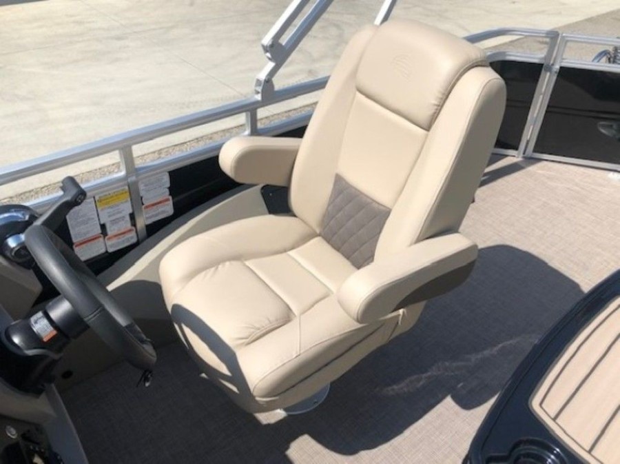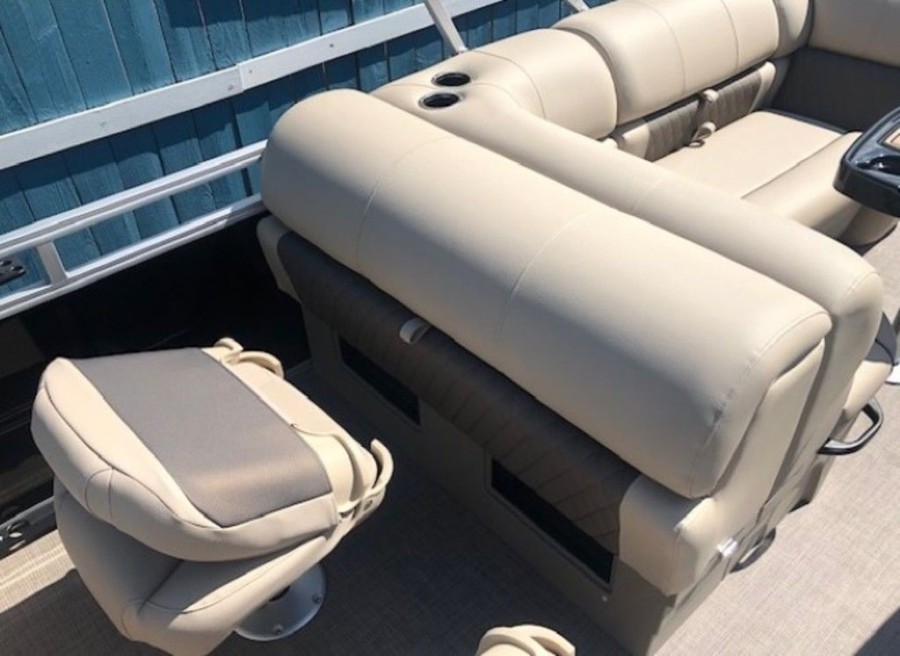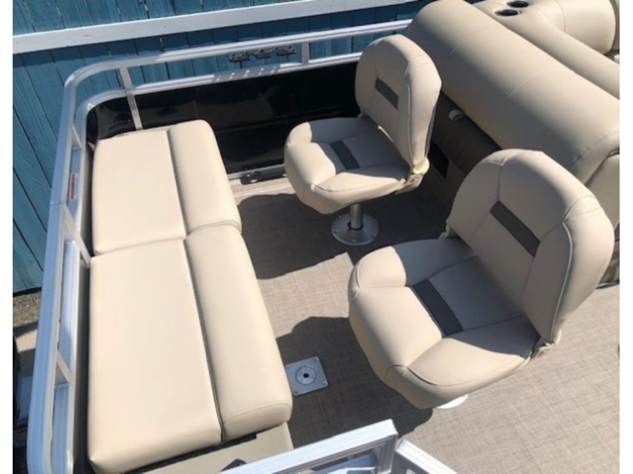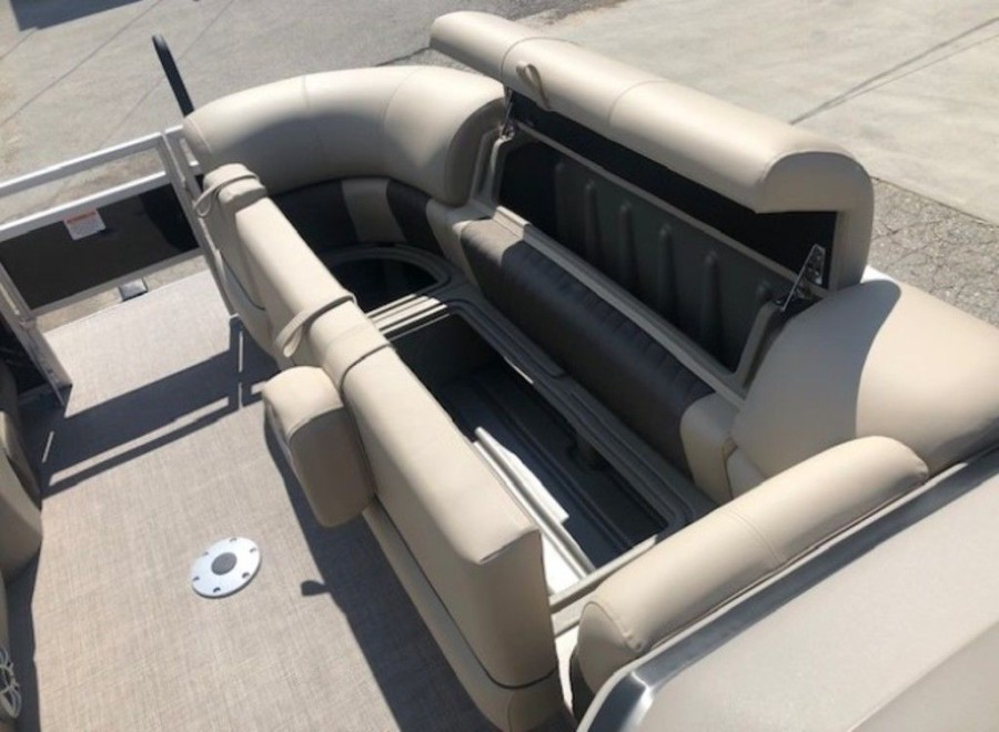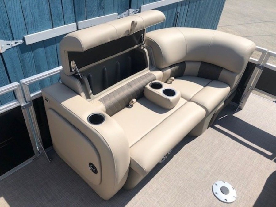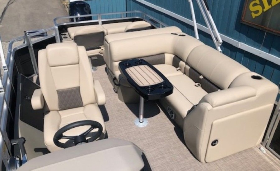 The aft deck of this Sun Tracker model is optimized for serious anglers. It features dual comfortable fishing chairs perfect for long days on the water. Essential equipment includes an aerated livewell, complete with a convenient lift-out bait bucket, alongside dedicated rod storage and a secure lockable rod box. This Sportfish 22 DLX provides everything needed to maximize your catch.