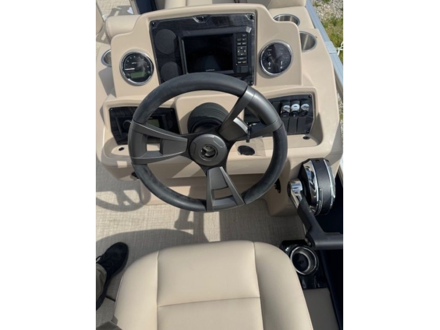 Fuel capacity is a convenient 25‑gallon direct fill transom tank. This new 2025 model comes in steel blue with 115 horsepower and is available now for buyers looking to enjoy smooth cruising at an affordable price point.