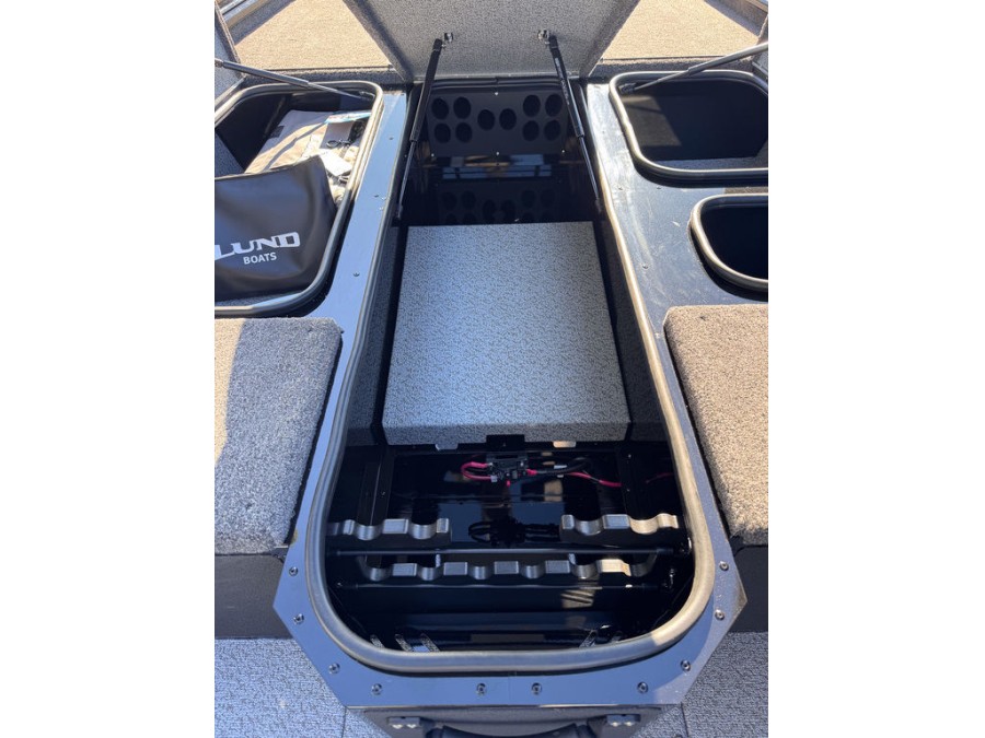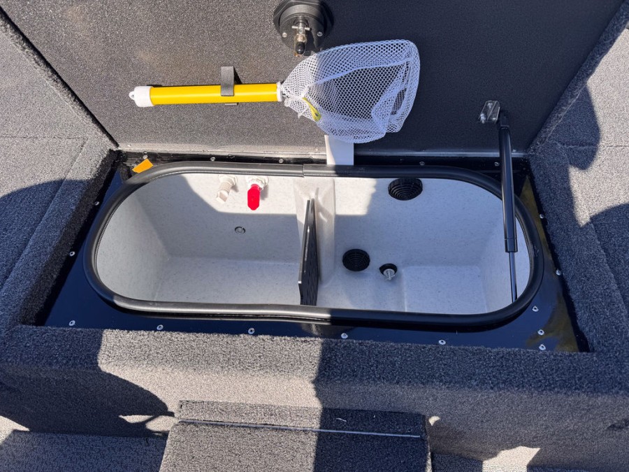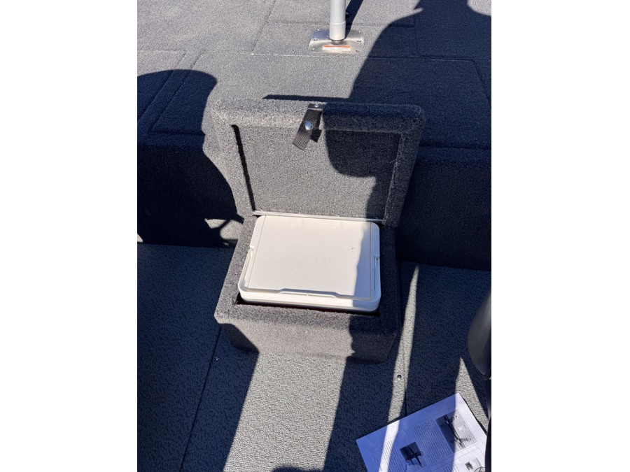 The interior is finished in single‑tone paint and features storage solutions such as bow on‑the‑go rod holders, lockable center bow storage (10 rods), port side rack, bubble‑seal compartments, and an integrated cooler space.
