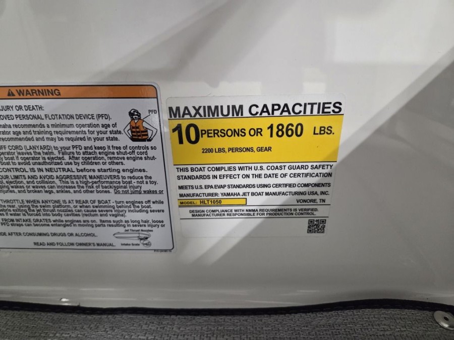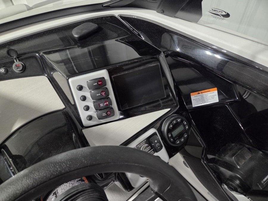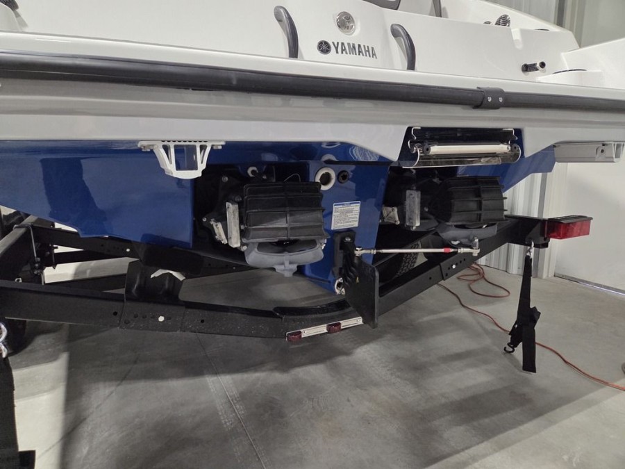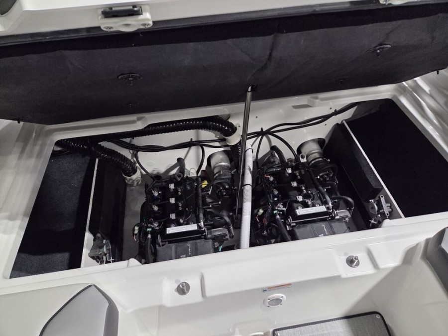The boat is powered by twin 3‑cylinder, 4‑stroke TR-1 Yamaha Marine Engines with a combined displacement of 1049 cc per engine. Each engine features a high‑pressure pump and dual battery setup for reliable performance. The hull is constructed from fiberglass/composite materials to ensure durability while maintaining light weight.