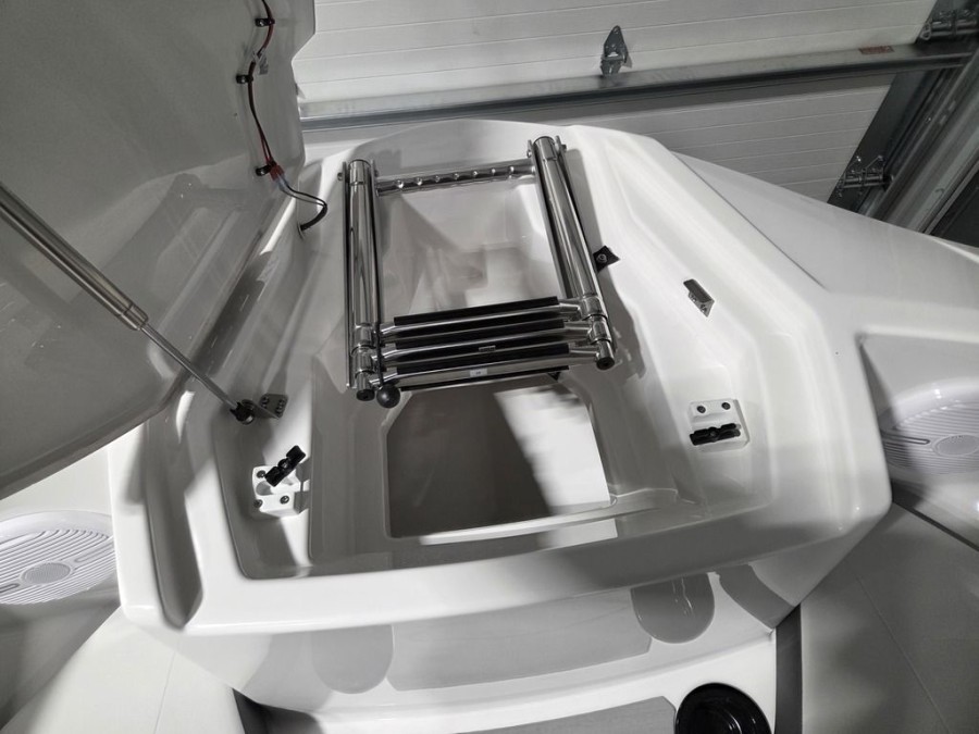 The AR220 boasts stainless steel bow rails, pop‑up cleats, a tow hook, and a sleek bimini top. Stainless steel telescopic reboarding ladder ensures easy entry and exit from the water. The cockpit drainage system (CDS) keeps the cabin dry during high winds or waves.