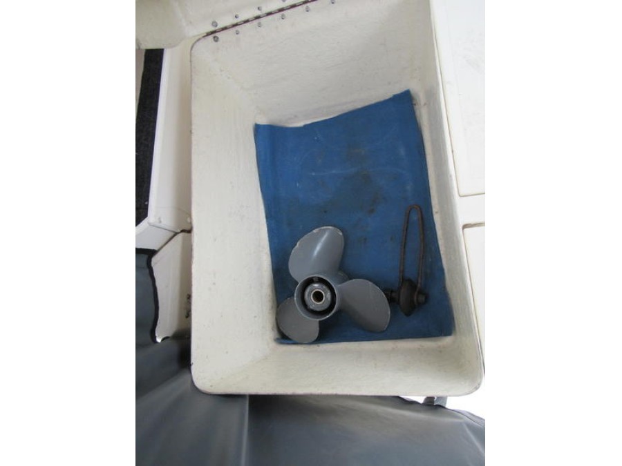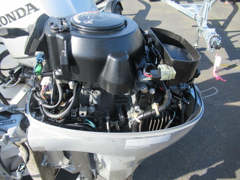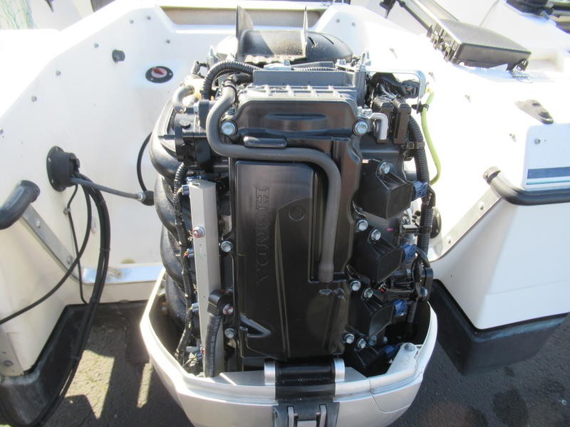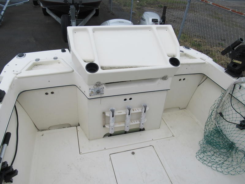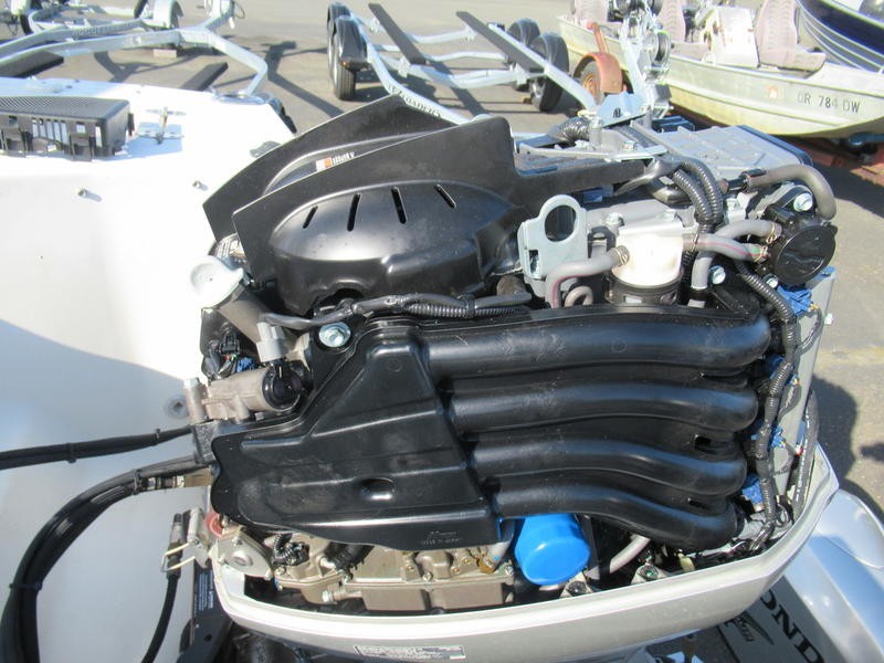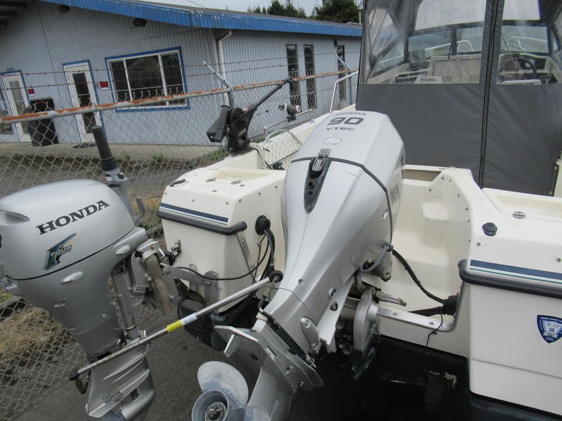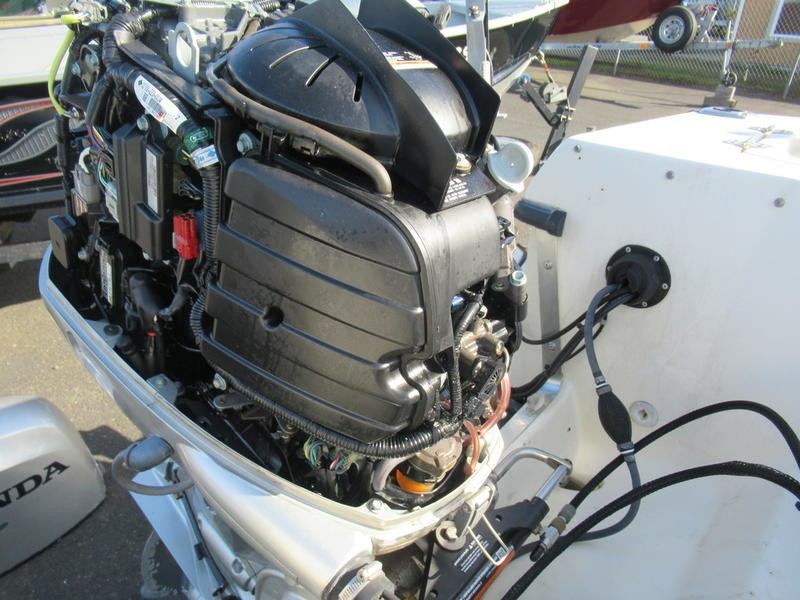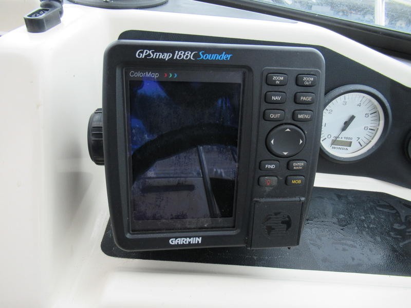 The boat also includes a 2010 90‑hp Honda engine (computer shows 1,003 hours) and an additional 8‑hp Honda unit for auxiliary power. Navigation is enhanced by Garmin GPS Map 188C, a Sounder, and Bottom Line Side Finder Fish Finder.