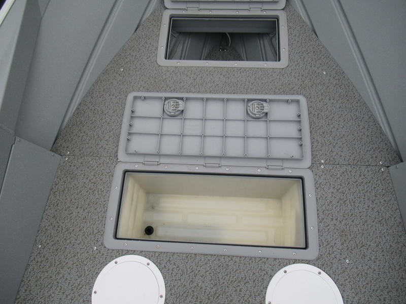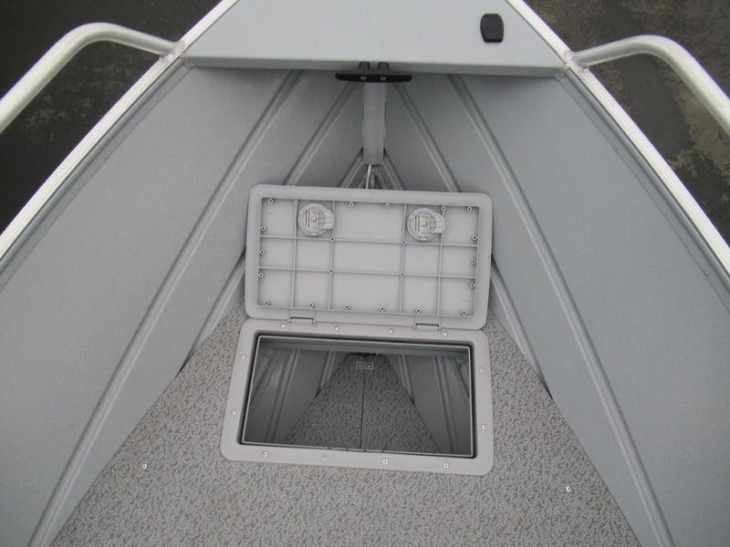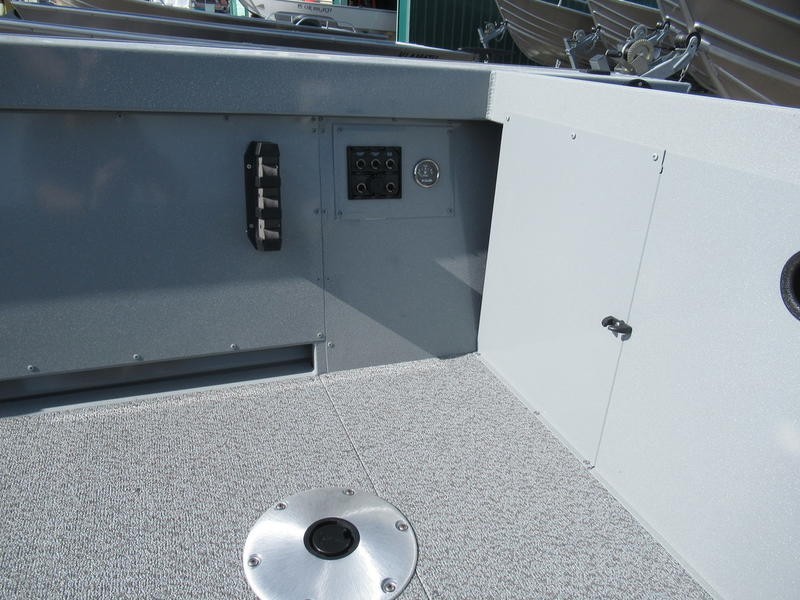 Inside the cabin you’ll find sleek gray upholstery along with practical features such as built‑in fuel storage and a robust battery for reliable power on the water.
