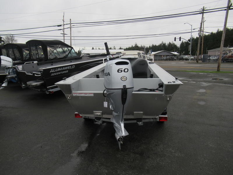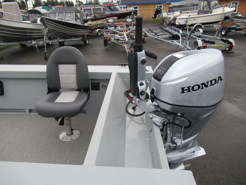 The boat comes equipped with an engine code BF60A1LRT, delivering 60 horsepower from a four‑stroke gasoline motor. Steering is handled by a tiller handle system.