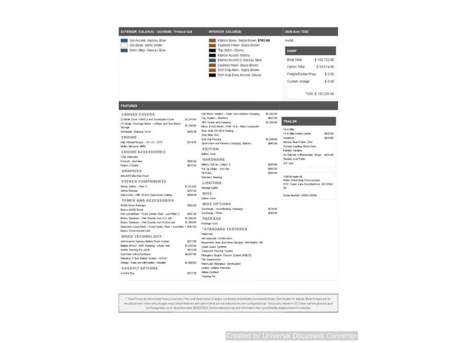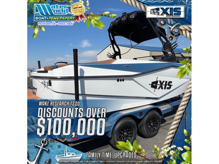 [read more]Discover the brand‑new Axis Wake Research T220, a top‑tier 22-foot wakeboarding vessel now available in Medford, Oregon. Designed for ultimate performance, this 2026 model features an advanced Malibu M5di engine and V-Drive propulsion system that delivers smooth power delivery on every run. Built with lightweight fiberglass/composite construction, the T220 offers durability without compromising speed or maneuverability.