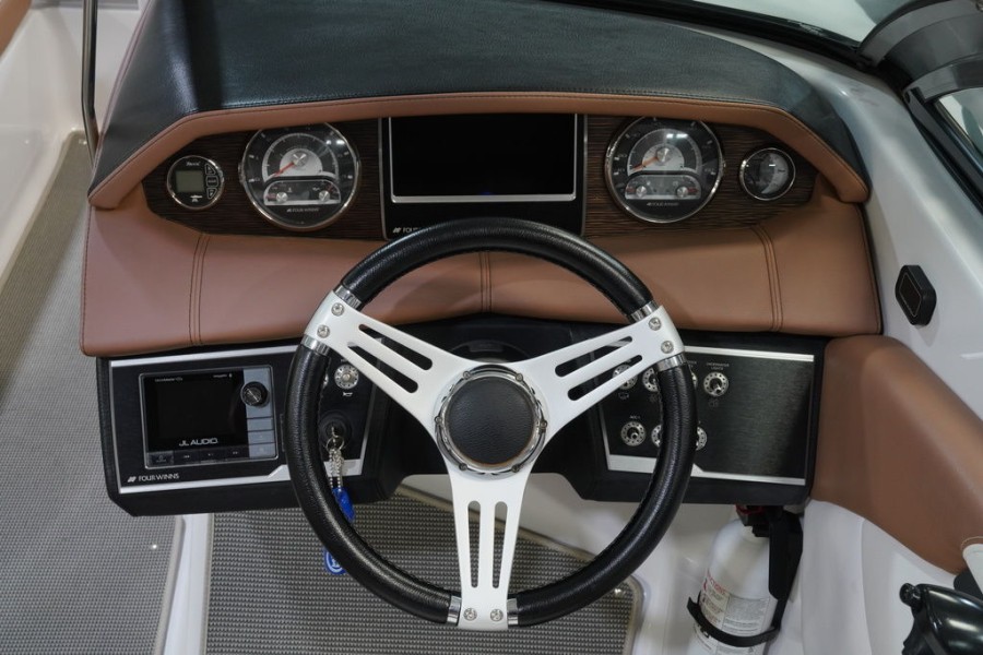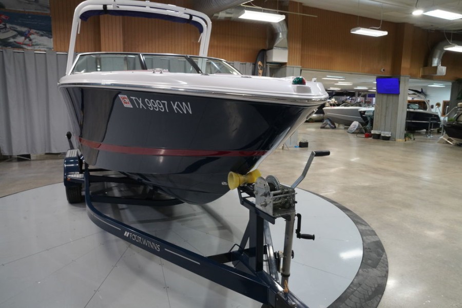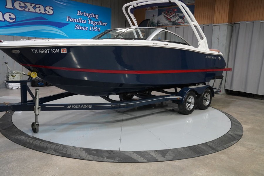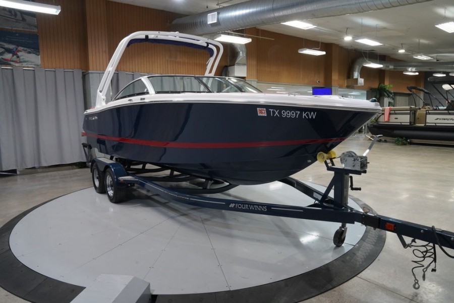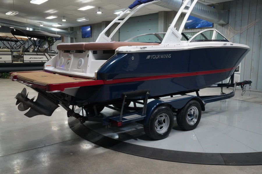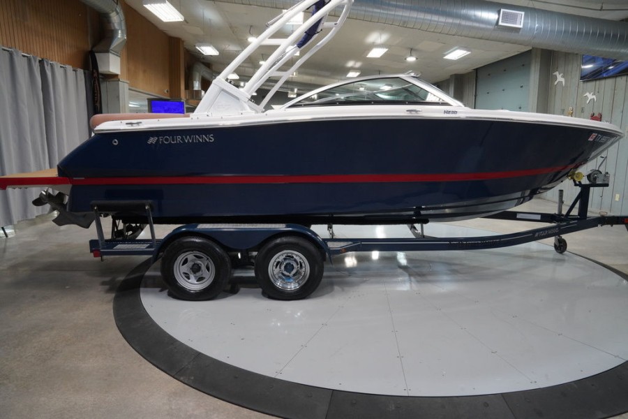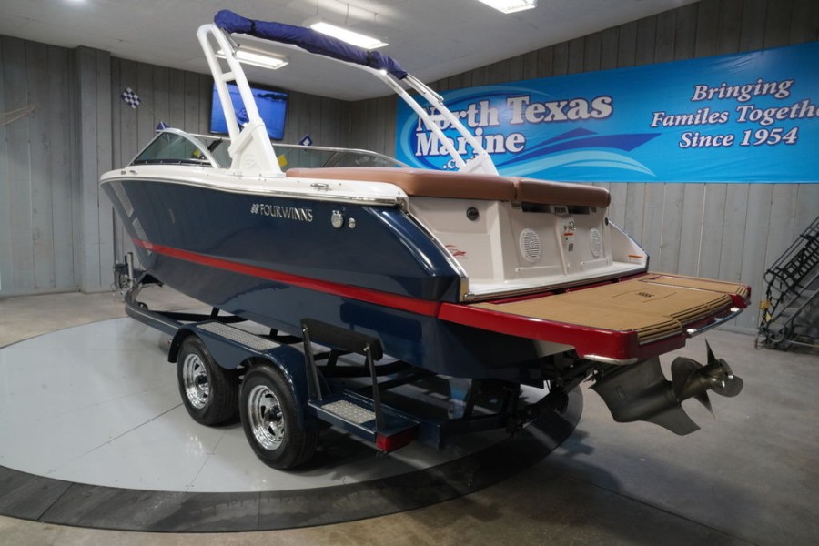 This model is paired with a unique Four Winns custom trailer, ensuring easy transport and reliable storage between excursions. The specifications highlight its robust build quality: