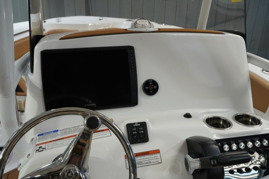 - Steering Console: Features custom stainless steel wheel hardware paired with a power knob for effortless control of the outboard engine setup.