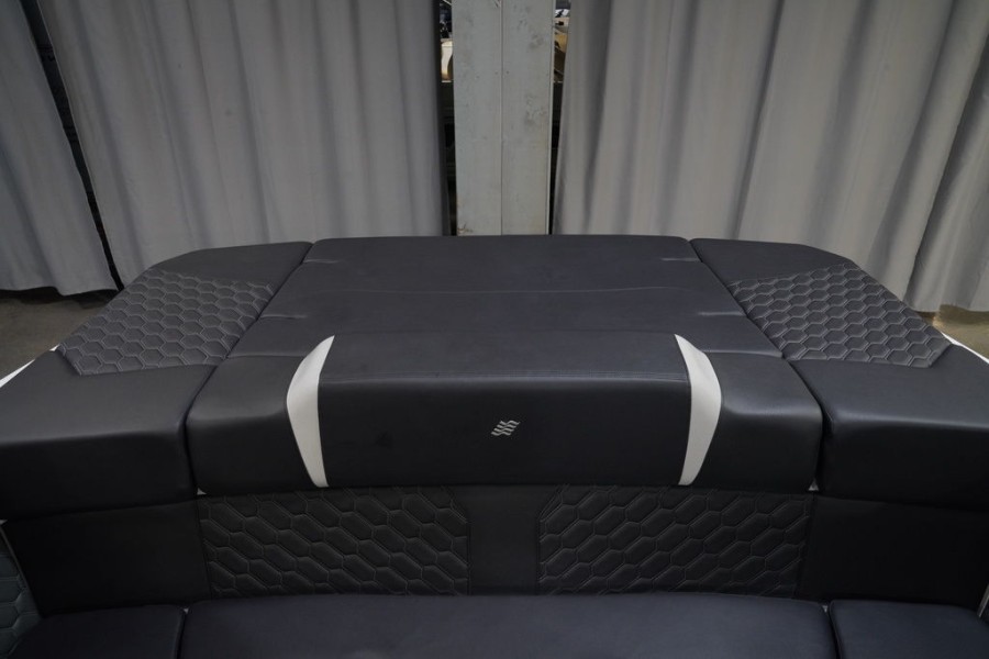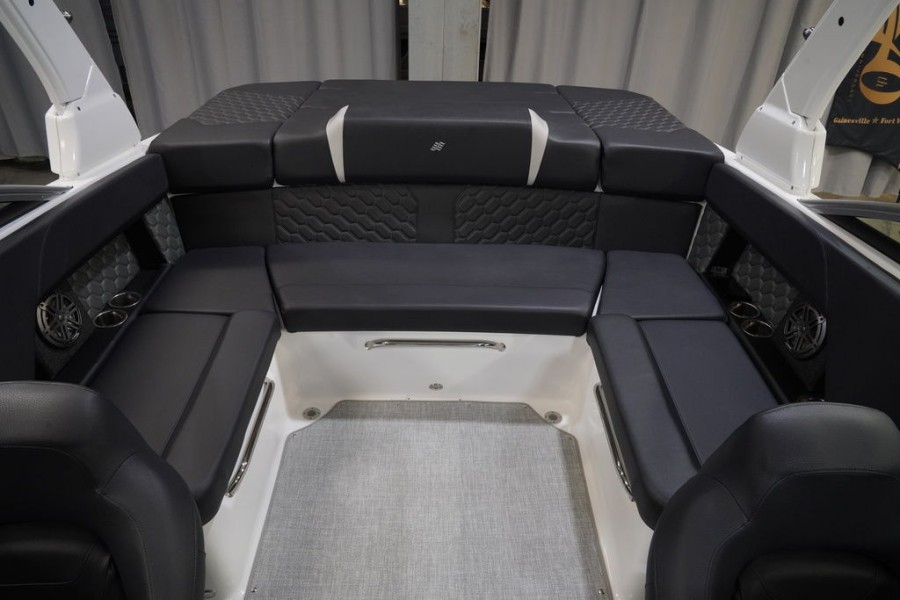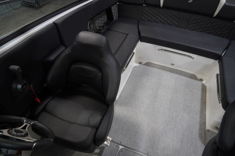For added leisure time, the aft sun-deck includes a comfortable chaise lounge area. The helm station itself features rich hand-wrapped vinyl and custom detailing, complemented by LED accent lighting that sets an upscale mood even at anchor. This attention to detail ensures every moment spent on your Four Winns H4 Surf is luxurious.