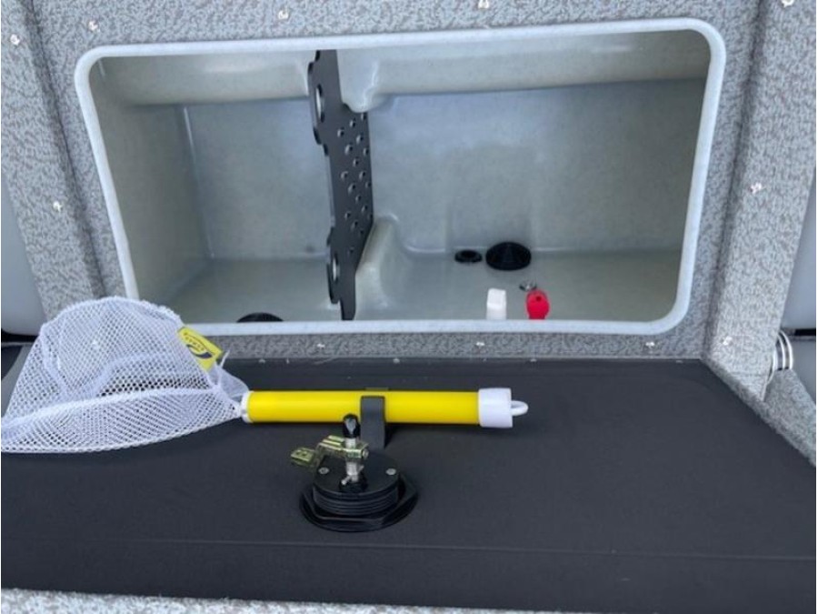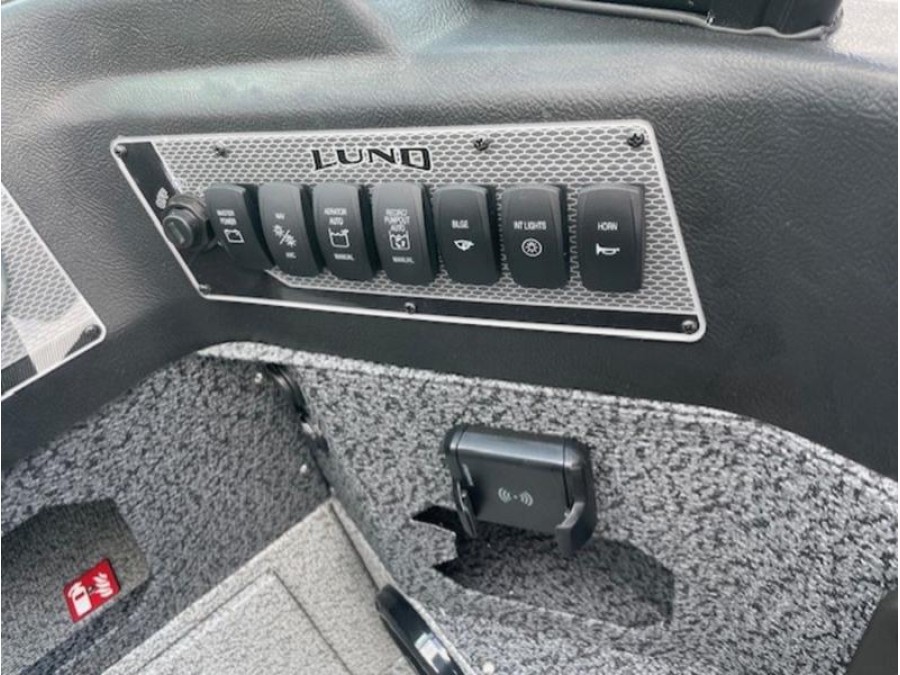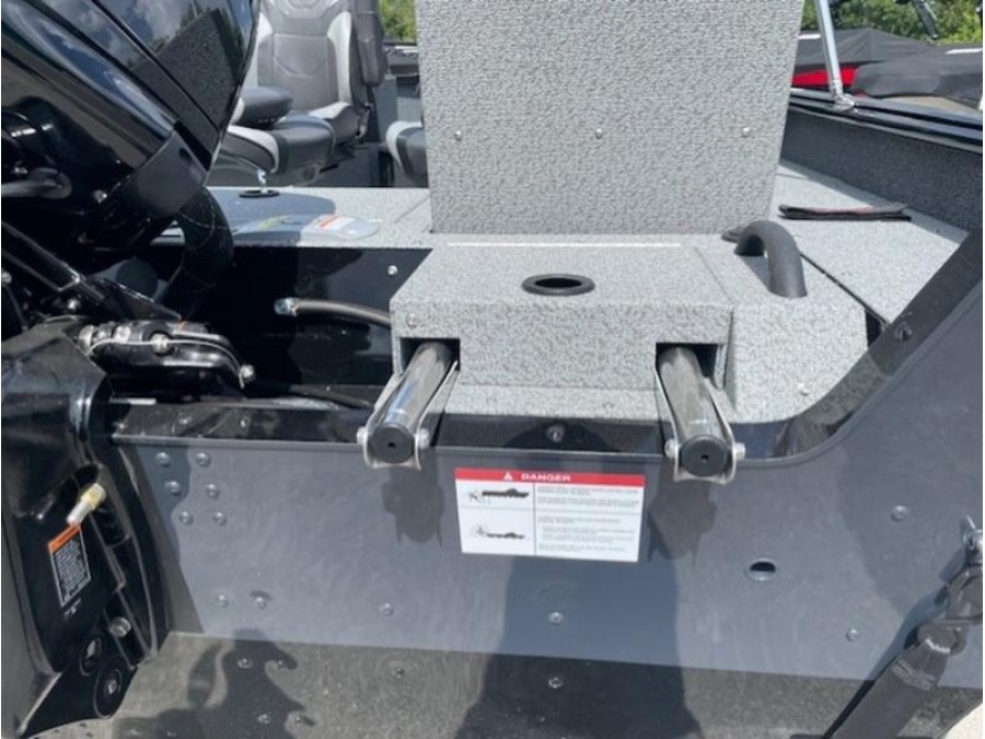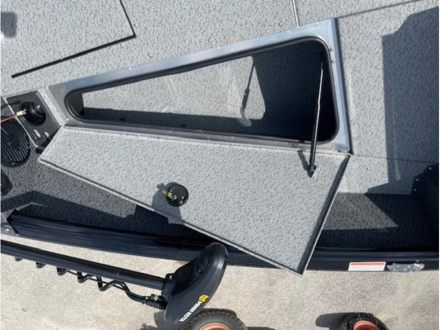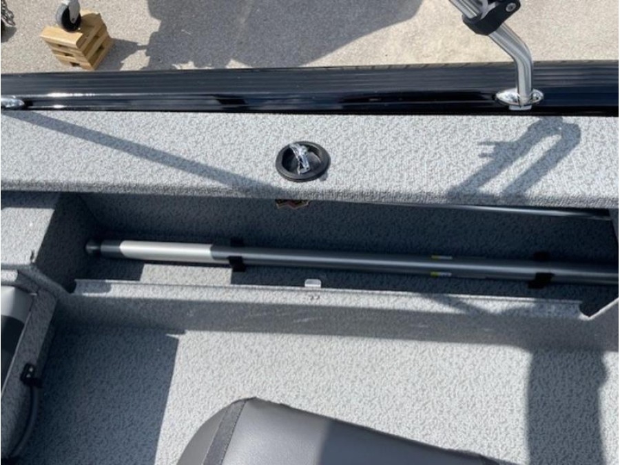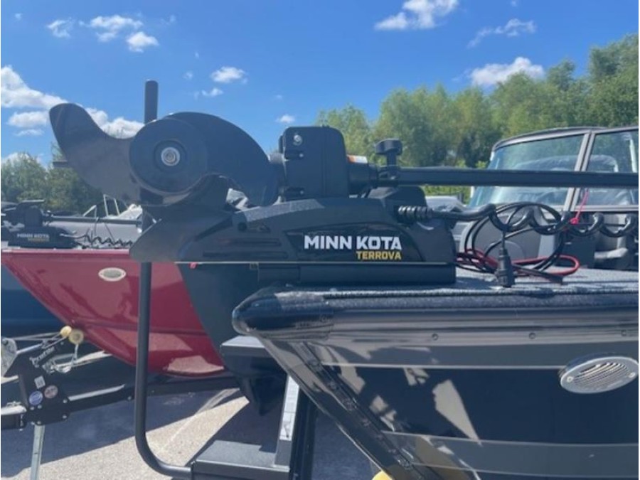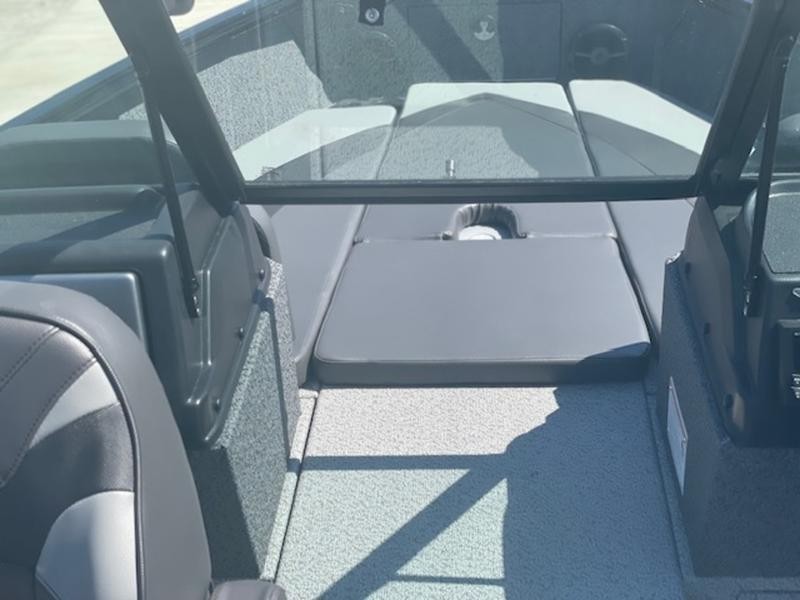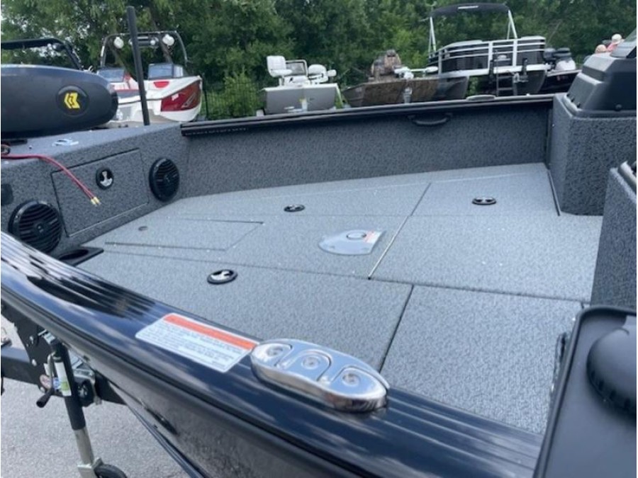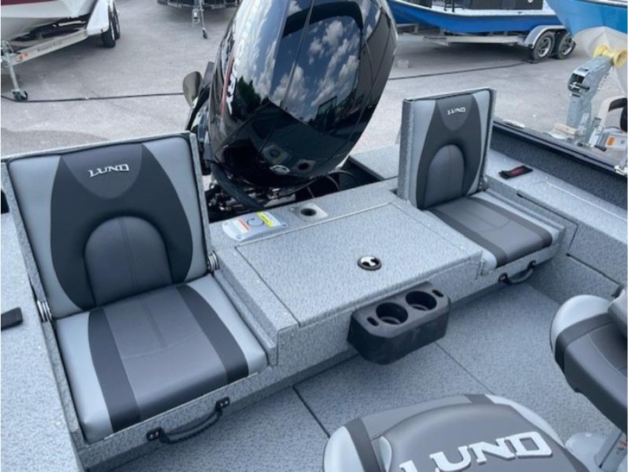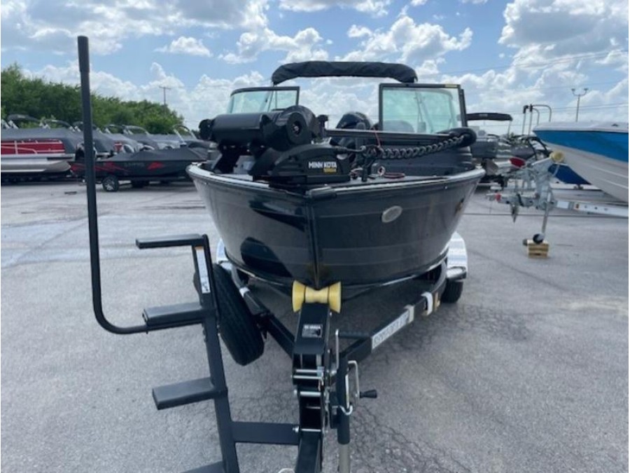This boat comes finished in a sleek gunmetal/black exterior and gray interior, featuring optional upgrades such as a swim ladder, Bimini top, sound system, and trolling motor for added convenience on the water. The Lund 1875 IMPACT XS is ready to provide an exceptional fishing experience right here in New Braunfels.