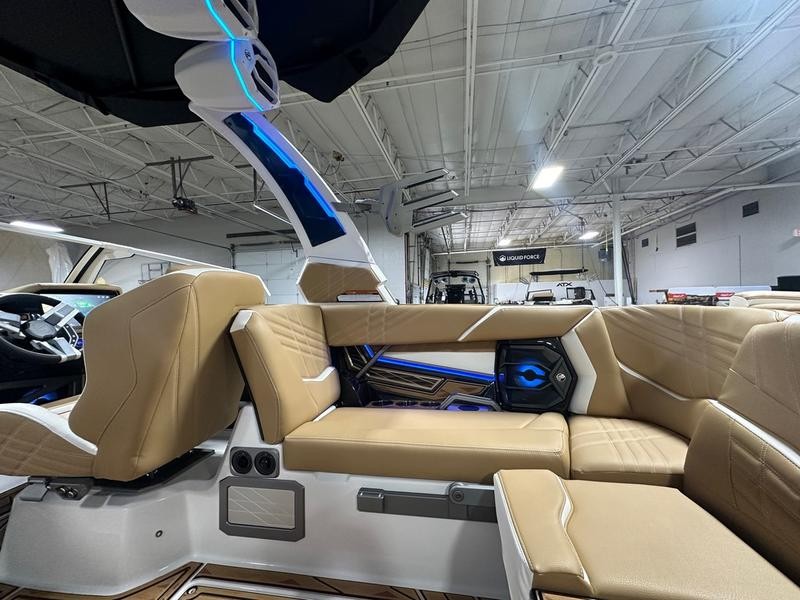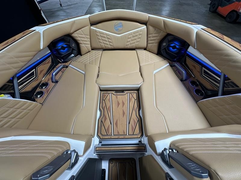 • Comfort & Convenience: Elite Transom Lounge Package, InCharge Phone Holder, Integrated Surf Locker Storage, Reversible Transom Seat, Life Jacket Hanger for Tower.