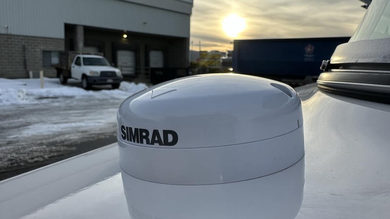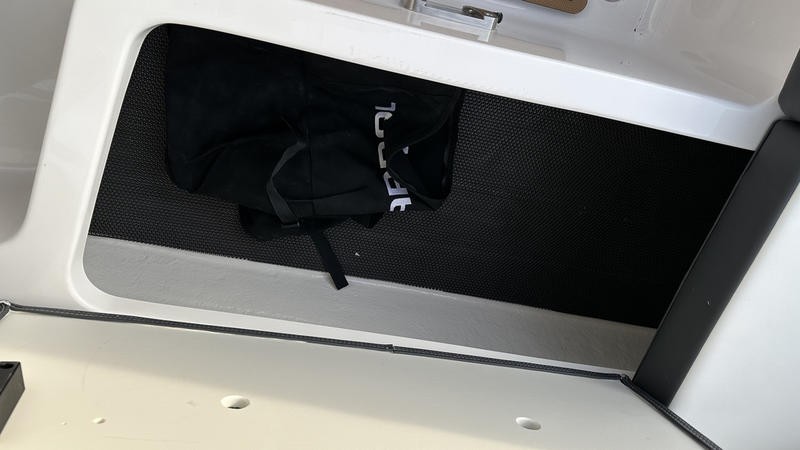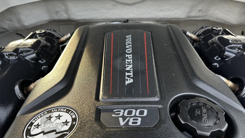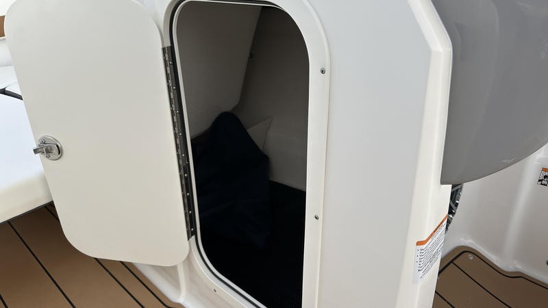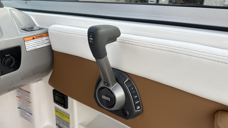 The cockpit features a Simrad G09 touchscreen multifunction chartplotter/fishfinder with SS60 transducer, engine data monitoring, and audio control—all accessible from the steering wheel. Power‑assisted tilt steering provides effortless handling even at high speeds.