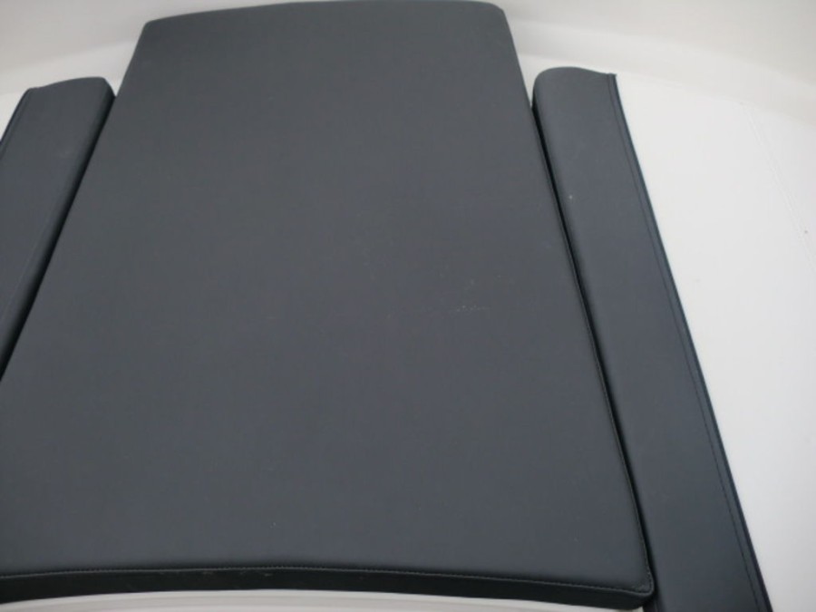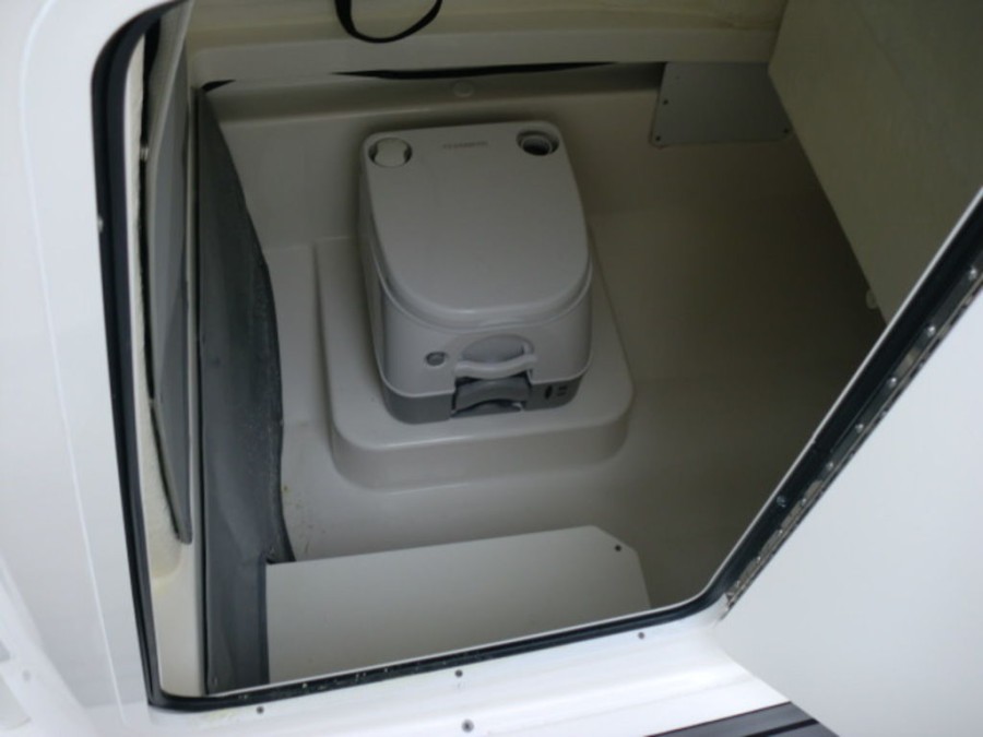 The interior showcases a graphite finish with premium seating options. The cockpit features gray flooring, a dedicated cockpit table, and portable head facilities. Freshwater shower systems are integrated for convenience on longer trips.