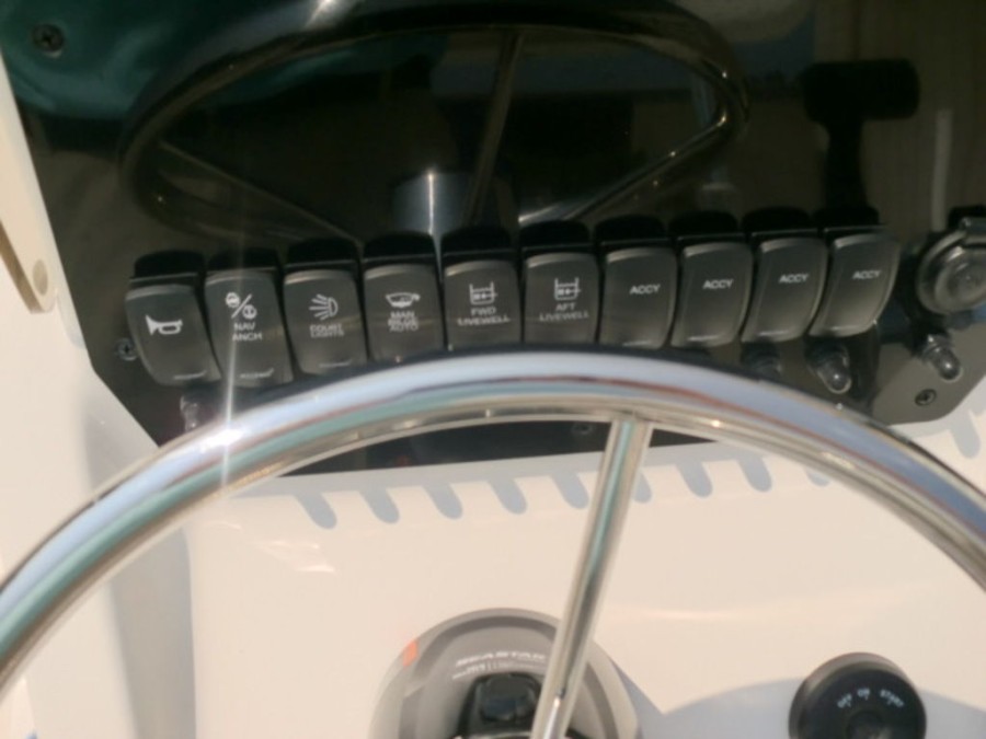 This 2023 Bulls Bay center console is brand new, fully equipped for fishing enthusiasts who demand reliability, comfort, and style. The ice blue hull stands out on any body of water while offering excellent visibility from the cockpit. With a powerful Mercury engine, livewells, hydraulic steering, and thoughtful deck layout, this boat delivers an unmatched sailing experience.