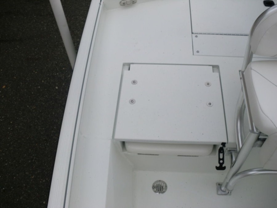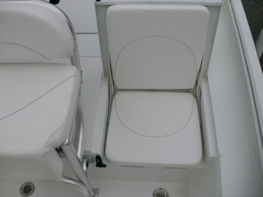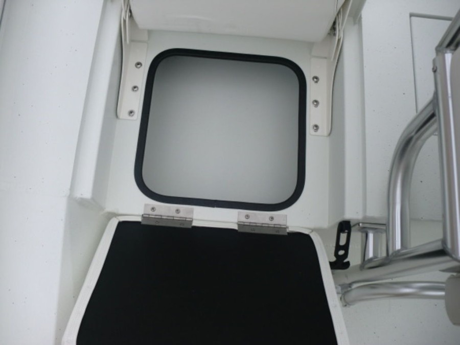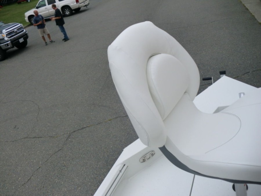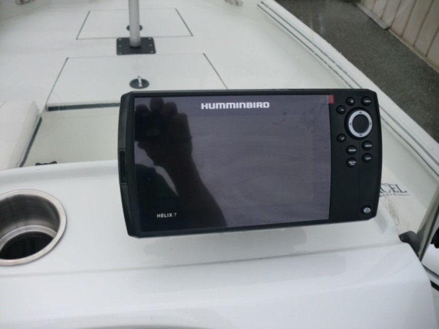 The cockpit features rod‑box cushions, a leaning post with back rest, and hydraulic steering, providing both luxury and control. Navigation is simplified by the Helix 7 Chirp MDI GPS system integrated into the dashboard.