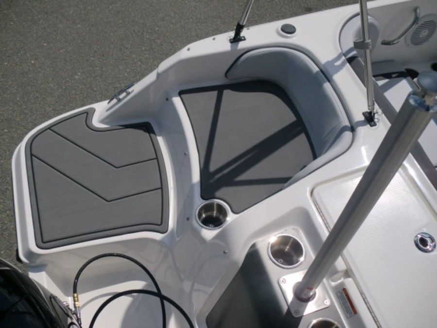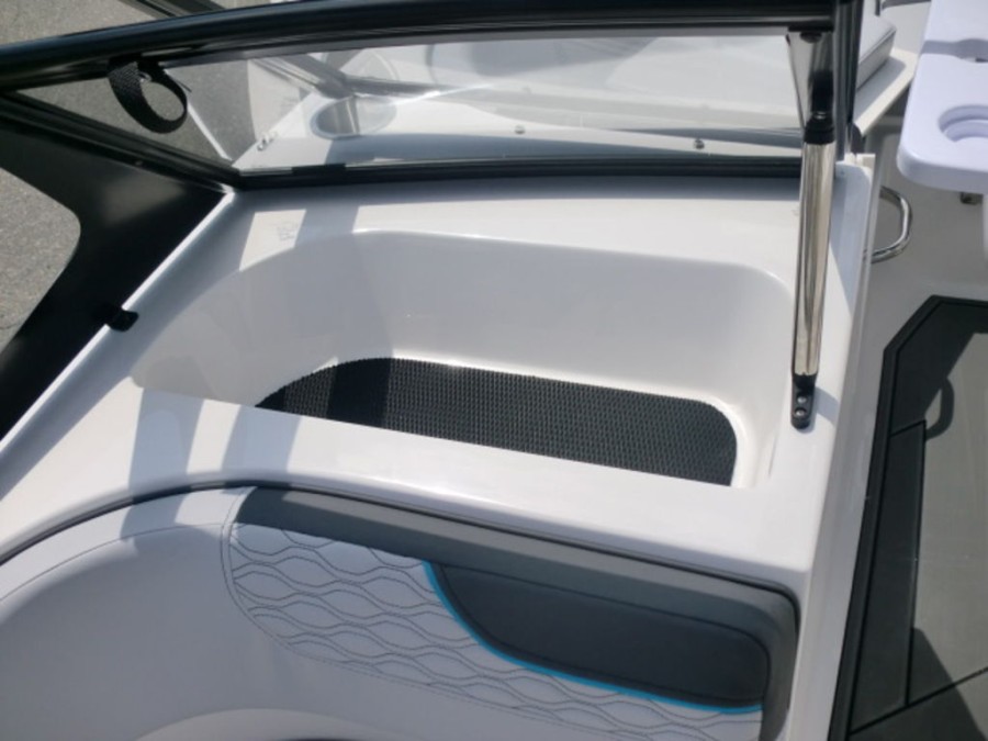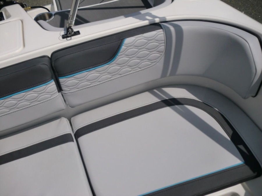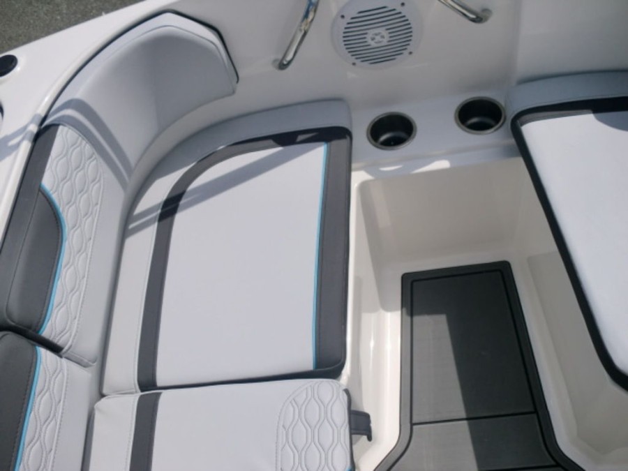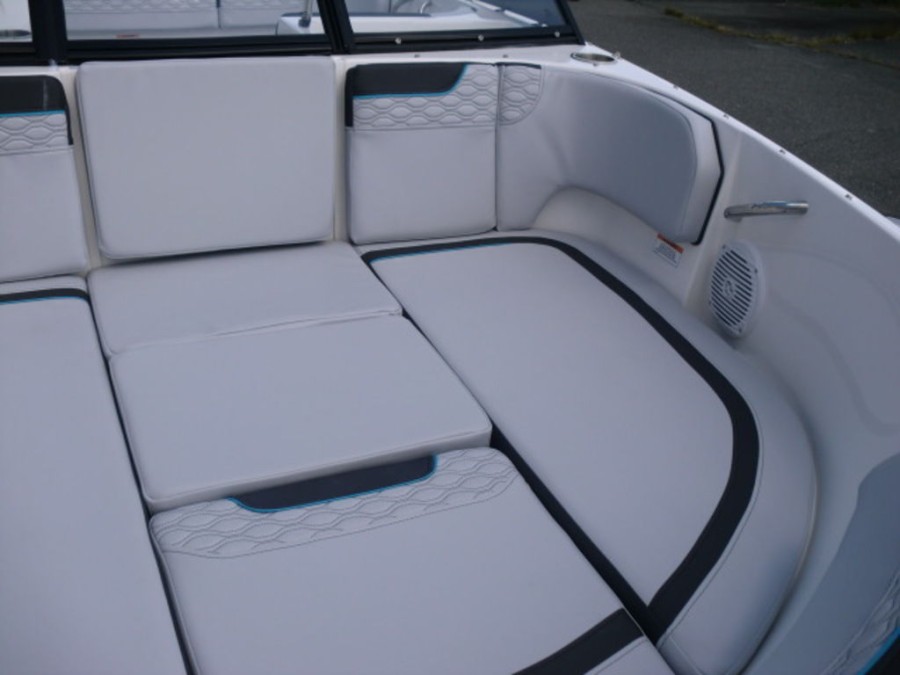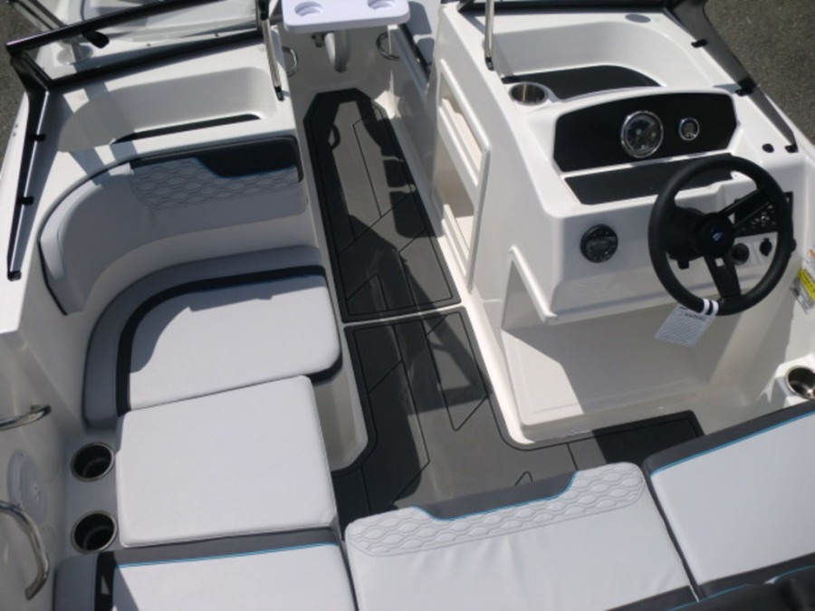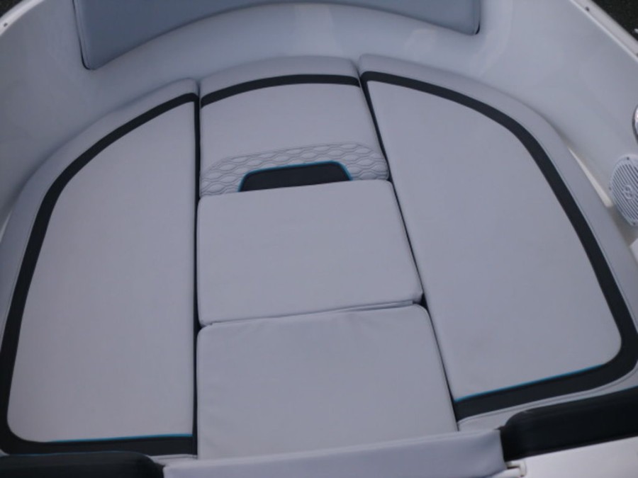 The M17 Deck Boat comes equipped with the M Comfort package, offering ergonomic seating and ample storage. The cockpit features gray matte flooring that blends style with functionality.