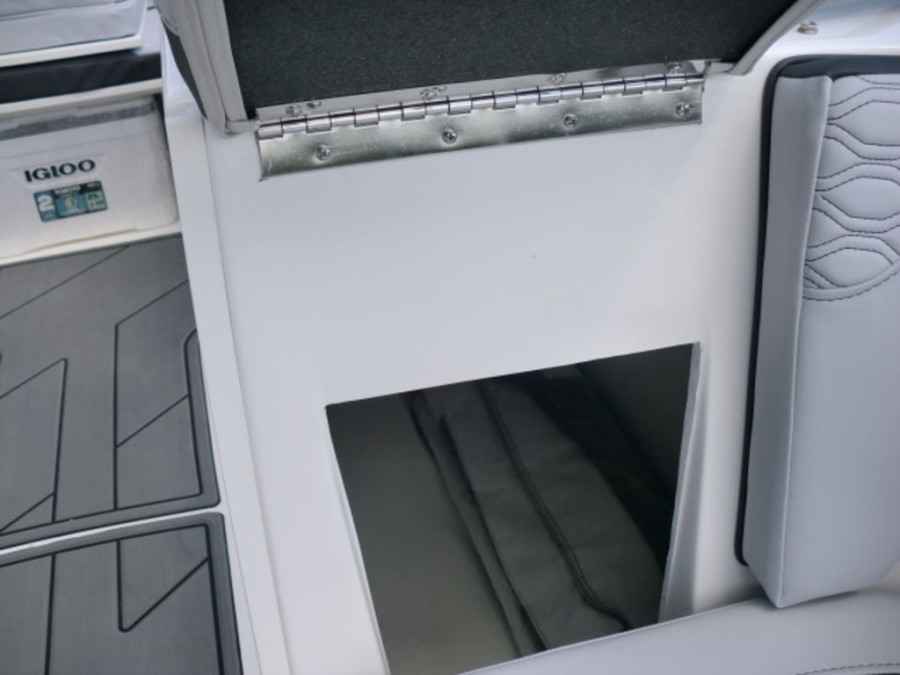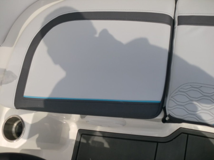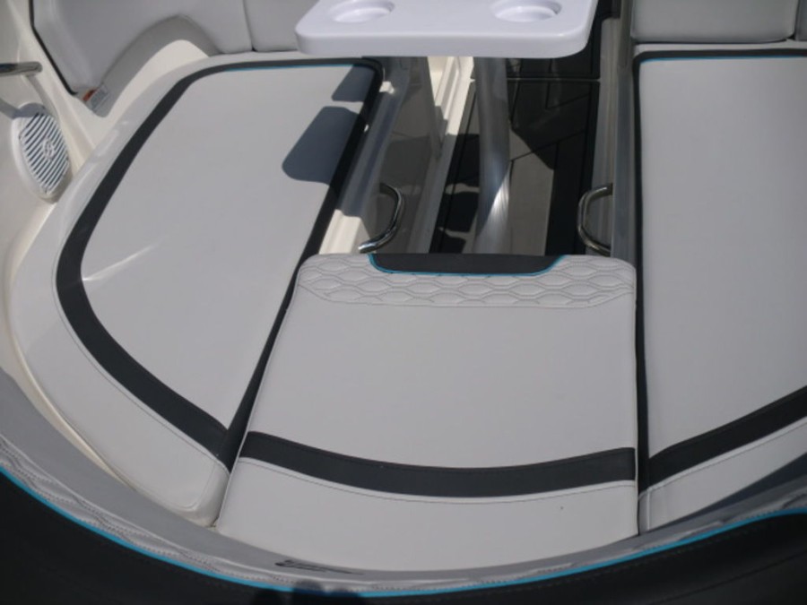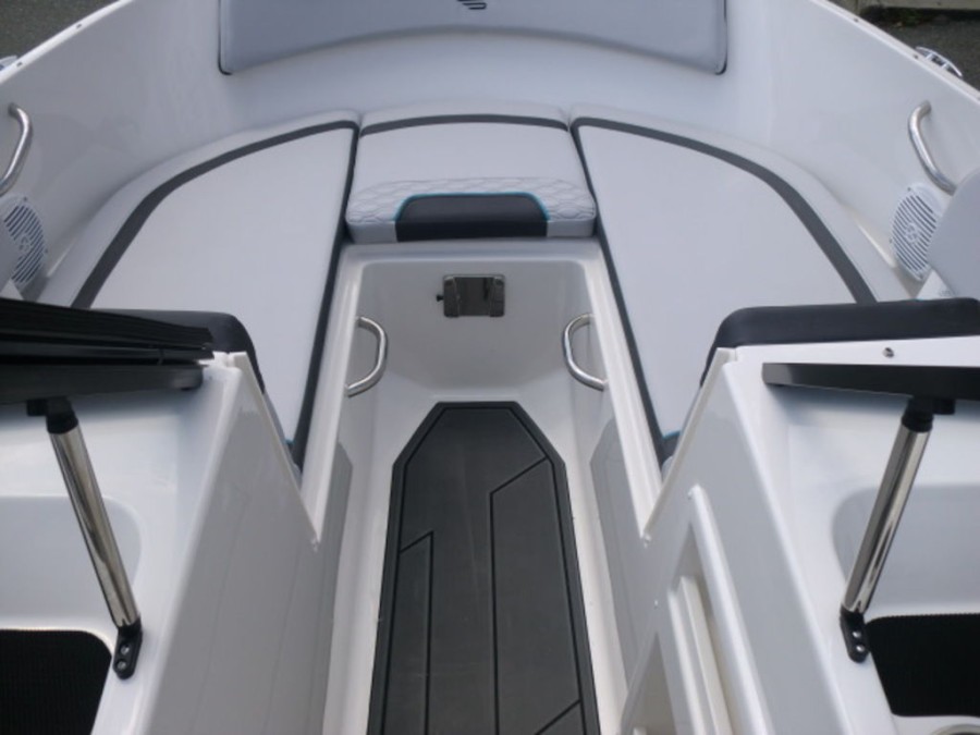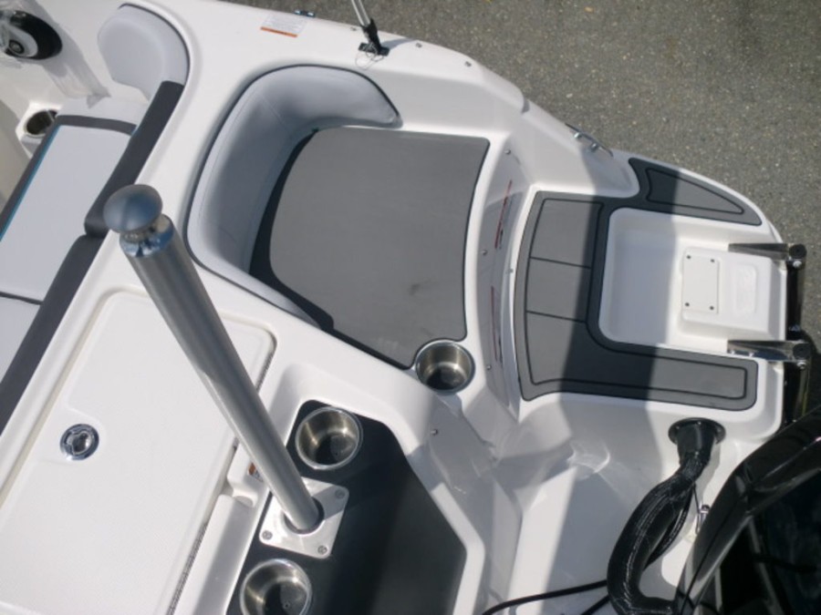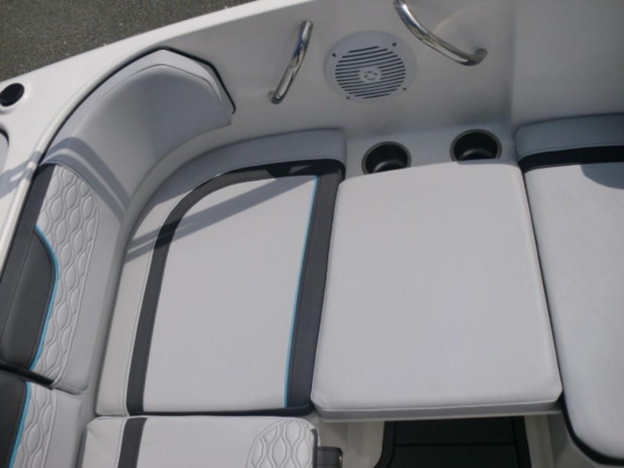 The M17 Deck Boat comes equipped with the M Comfort package, offering ergonomic seating and ample storage. The cockpit features gray matte flooring that blends style with functionality.