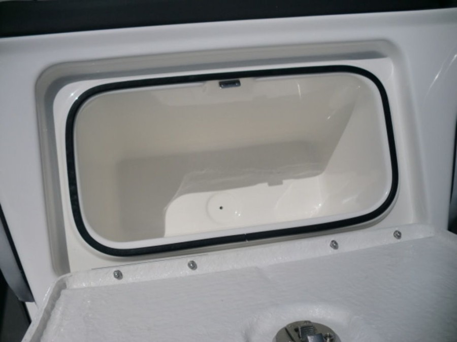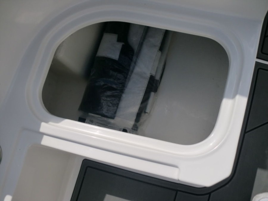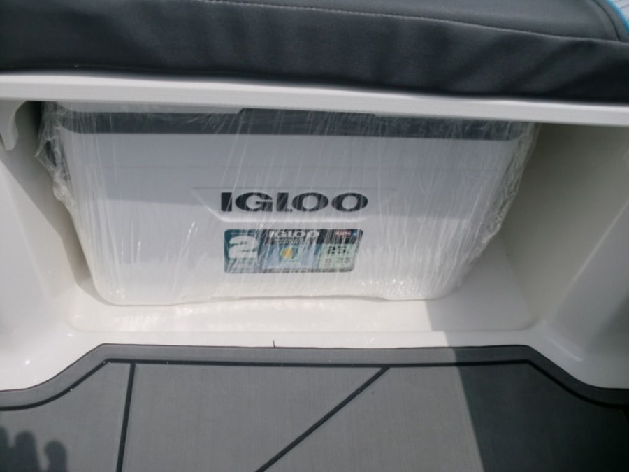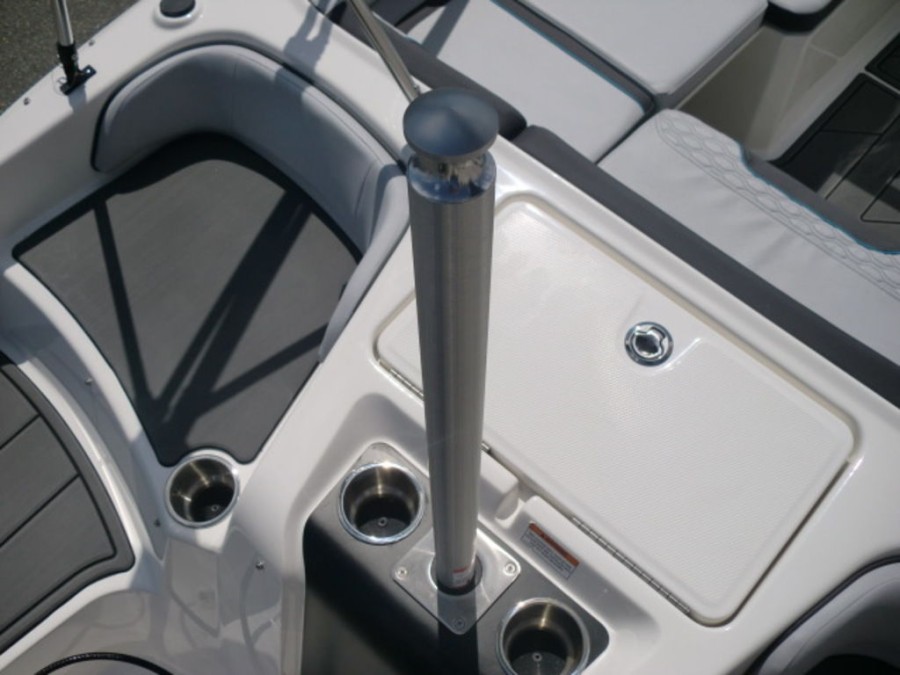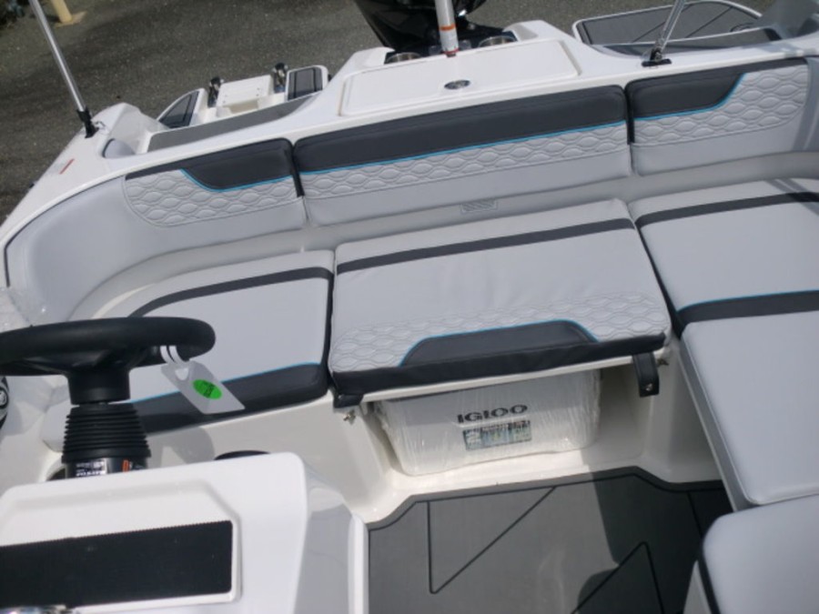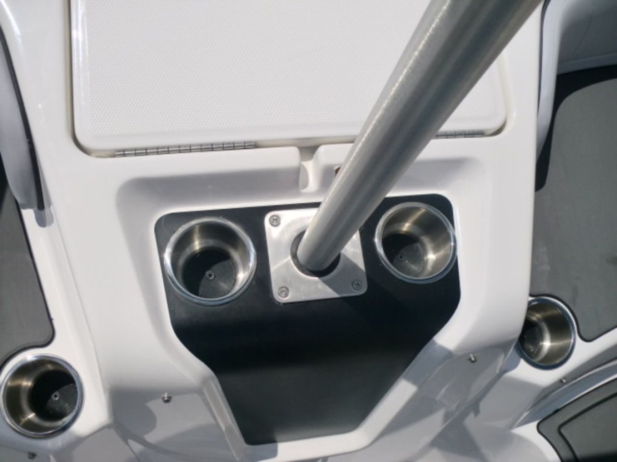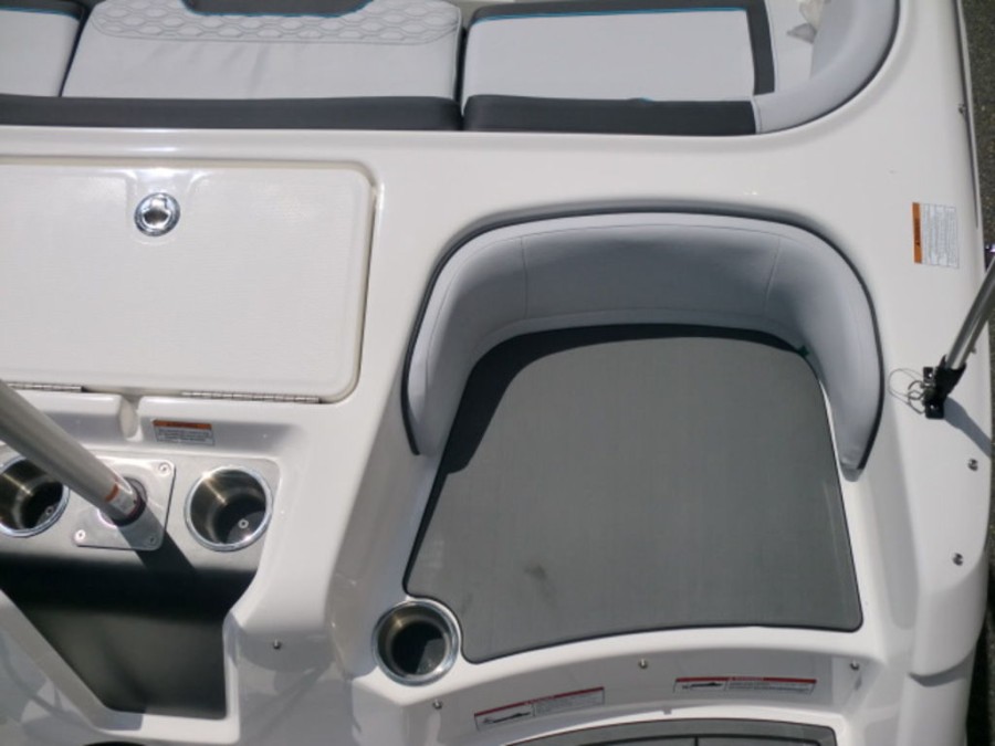 The M17 Deck Boat comes equipped with the M Comfort package, offering ergonomic seating and ample storage. The cockpit features gray matte flooring that blends style with functionality.