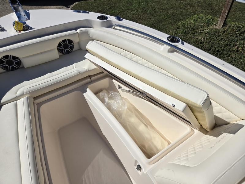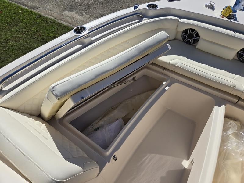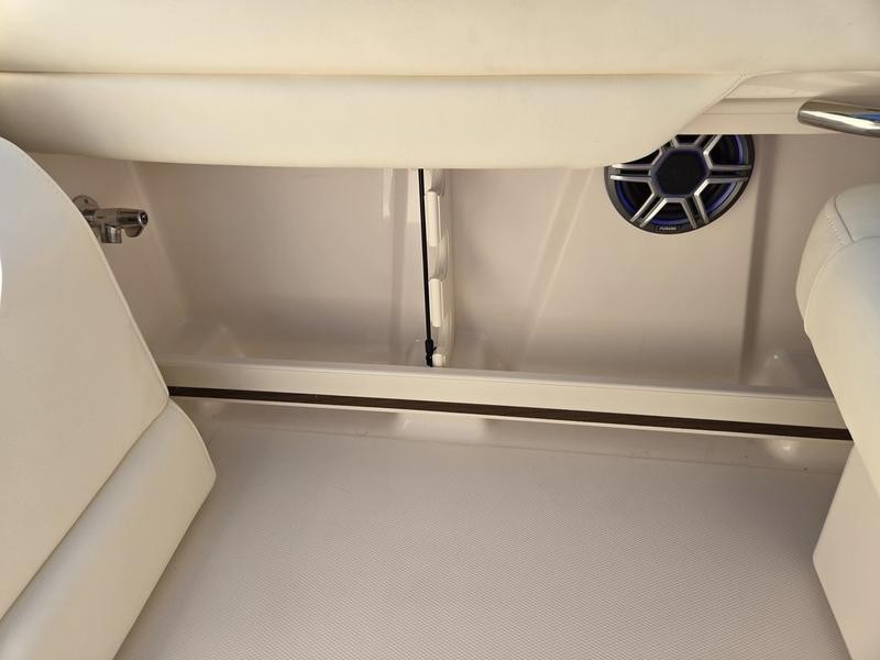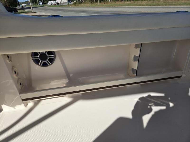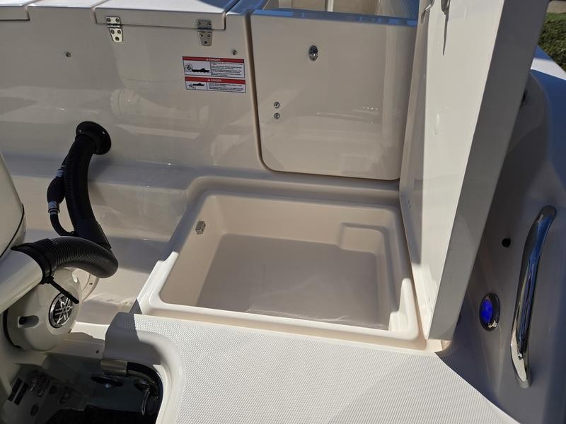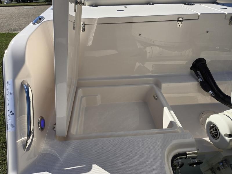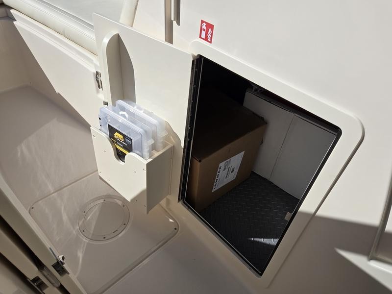 Entertainment and convenience are covered as well: the boat offers a Fusion Stereo system, 12‑inch Garmin navigation display paired with VHF radio, LED recessed lights (red, blue, white), side‑mounted rod holders, a hydraulic trim tab system, and an electromechanically extendable aft lounge seat. A dedicated fish/ice box holds up to 160 qt., while a livewell delivers 15½ gal of fresh water for extended trips.