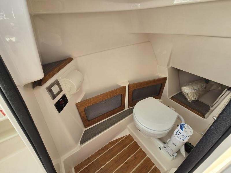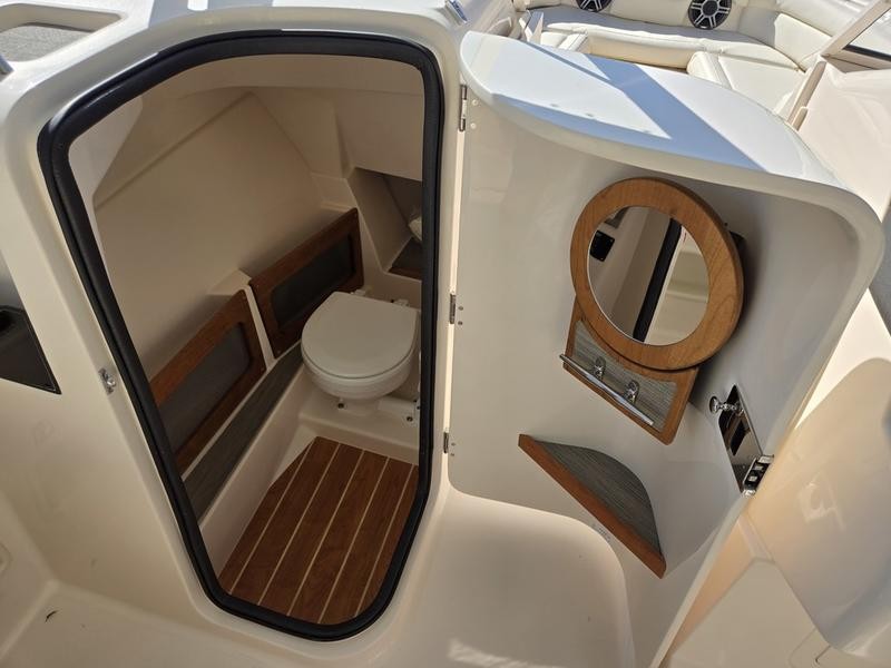 The Freedom 235 is equipped with a host of family‑friendly features. A wide cockpit includes front and side curtains, a bow cover, an aft curtain, and a ski tow for water sports enthusiasts. Comfort amenities include a pressurized freshwater washdown system, a 20‑gal fresh-water tank, a lockable port console head with dome light, a composite cherry & holly sole, and a sink with marine head that features electric flush.