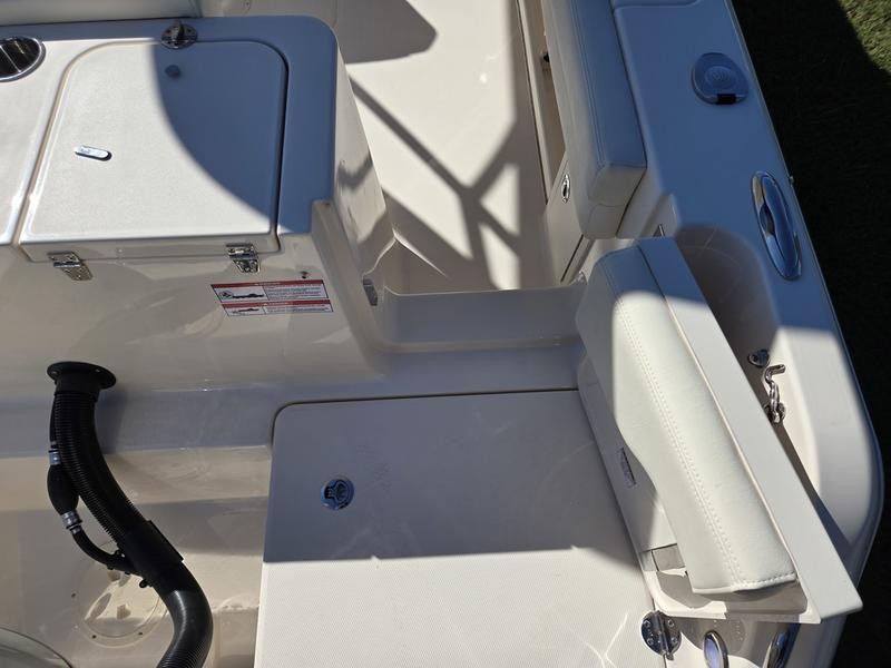 Safety is paramount: an automatic bilge pump (1 500 GPH) keeps the cockpit dry, while basic flotation, non‑skid fiberglass liner panels, and 316 stainless steel through‑hull fittings provide reliable protection. The deck boasts a self‑bailing cockpit with four drains, hand‑laid SeaV² hull construction for strength, and high‑density PVC rubrails for secure footing.